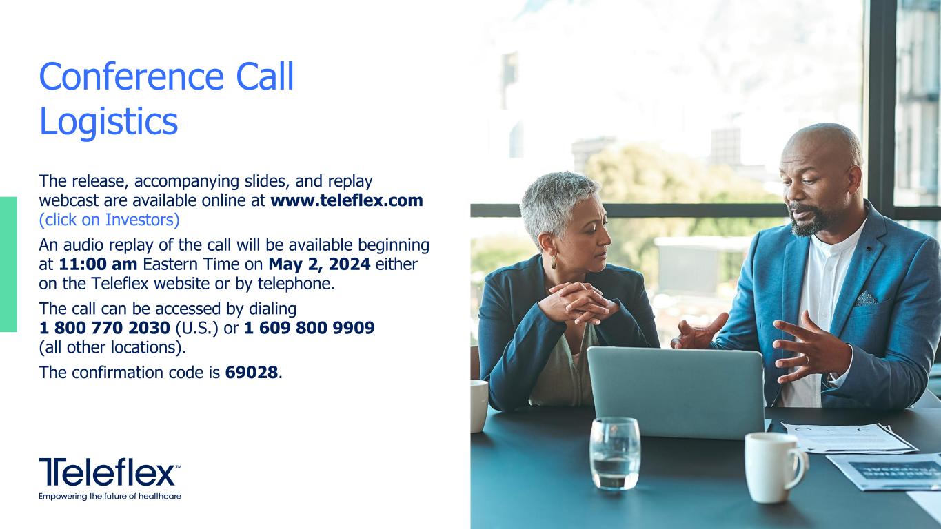 The release, accompanying slides, and replay webcast are available online at www.teleflex.com (click on Investors) An audio replay of the call will be available beginning at 11:00 am Eastern Time on May 2, 2024 either on the Teleflex website or by telephone. The call can be accessed by dialing 1 800 770 2030 (U.S.) or 1 609 800 9909 (all other locations). The confirmation code is 69028. Conference Call Logistics
