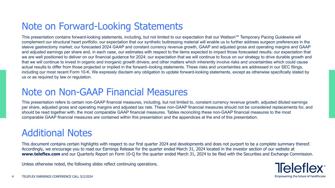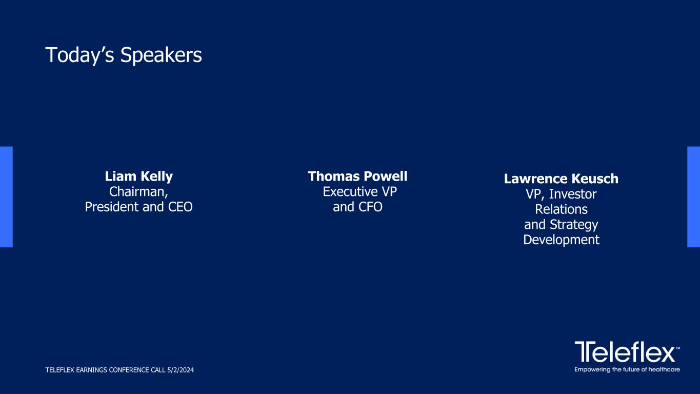 Today’s Speakers TELEFLEX EARNINGS CONFERENCE CALL 5/2/2024 Lawrence Keusch VP, Investor Relations and Strategy Development Liam Kelly Chairman, President and CEO Thomas Powell Executive VP and CFO