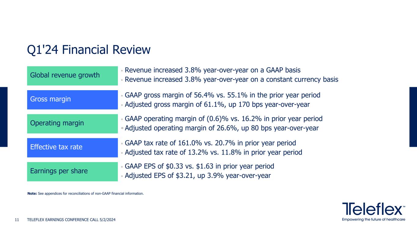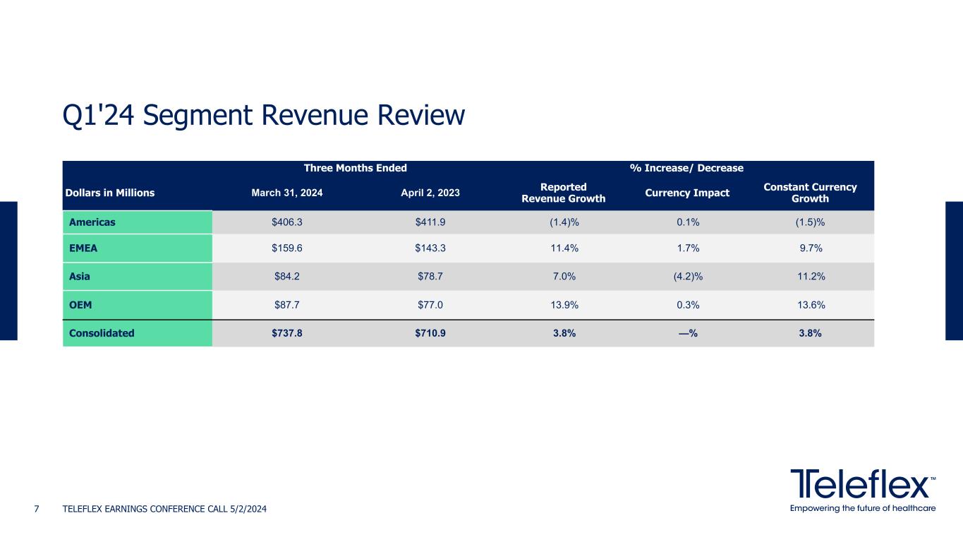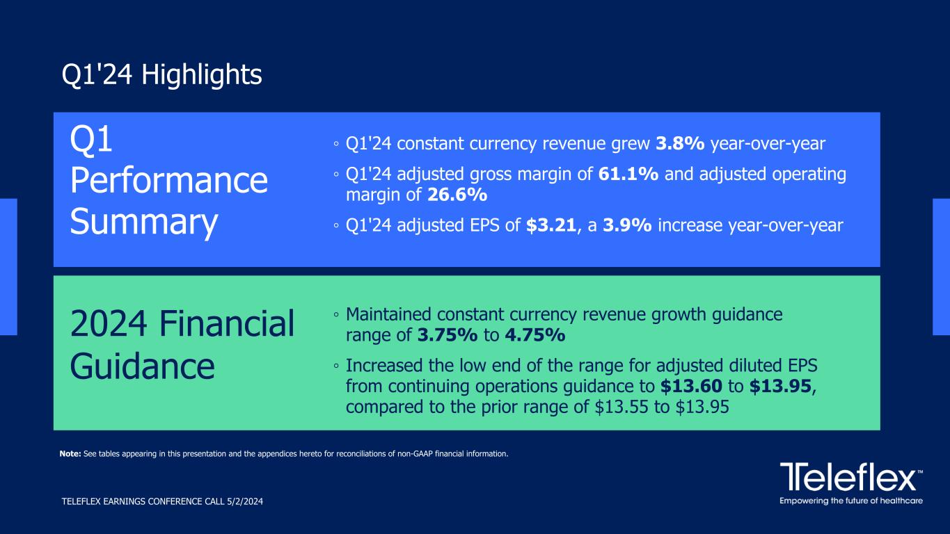 Q1 Performance Summary ◦ Maintained constant currency revenue growth guidance range of 3.75% to 4.75% ◦ Increased the low end of the range for adjusted diluted EPS from continuing operations guidance to $13.60 to $13.95, compared to the prior range of $13.55 to $13.95 ◦ Q1'24 constant currency revenue grew 3.8% year-over-year ◦ Q1'24 adjusted gross margin of 61.1% and adjusted operating margin of 26.6% ◦ Q1'24 adjusted EPS of $3.21, a 3.9% increase year-over-year Q1'24 Highlights 2024 Financial Guidance Note: See tables appearing in this presentation and the appendices hereto for reconciliations of non-GAAP financial information. TELEFLEX EARNINGS CONFERENCE CALL 5/2/2024