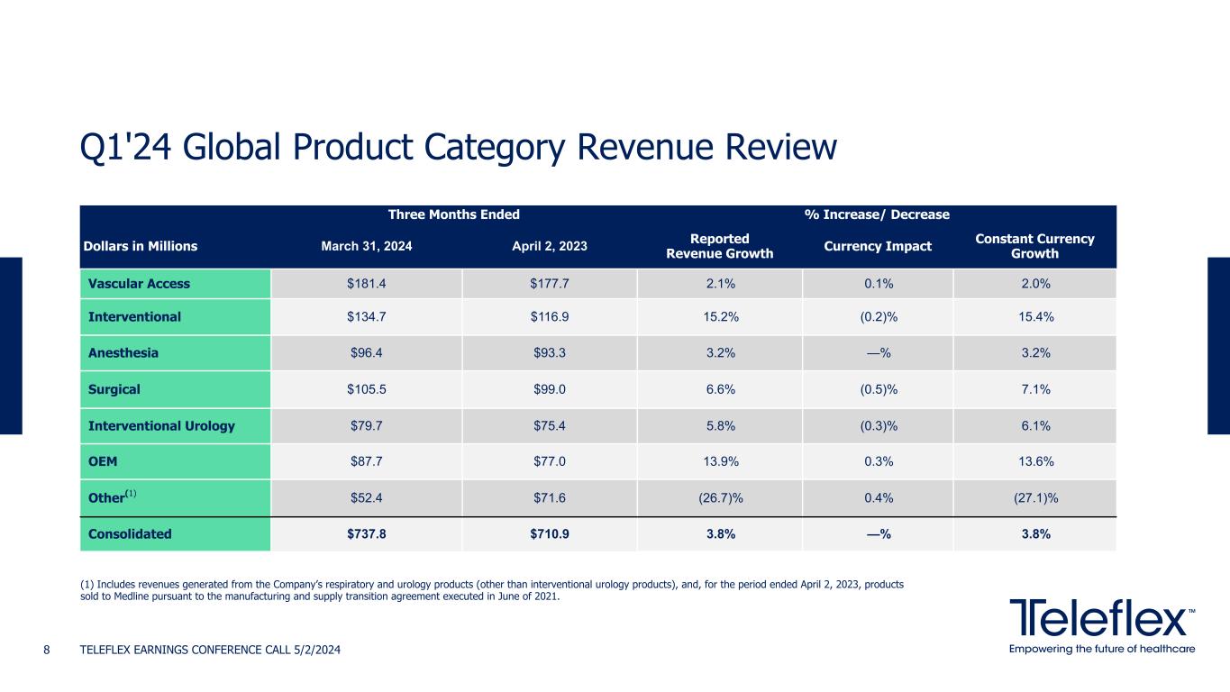 Q1'24 Segment Revenue Review TELEFLEX EARNINGS CONFERENCE CALL 5/2/20247 Three Months Ended % Increase/ Decrease Dollars in Millions March 31, 2024 April 2, 2023 Reported Revenue Growth Currency Impact Constant Currency Growth Americas $406.3 $411.9 (1.4)% 0.1% (1.5)% EMEA $159.6 $143.3 11.4% 1.7% 9.7% Asia $84.2 $78.7 7.0% (4.2)% 11.2% OEM $87.7 $77.0 13.9% 0.3% 13.6% Consolidated $737.8 $710.9 3.8% —% 3.8%