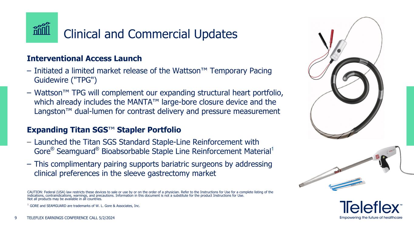 CAUTION: Federal (USA) law restricts these devices to sale or use by or on the order of a physician. Refer to the Instructions for Use for a complete listing of the indications, contraindications, warnings, and precautions. Information in this document is not a substitute for the product Instructions for Use. Not all products may be available in all countries. 1 GORE and SEAMGUARD are trademarks of W. L. Gore & Associates, Inc. Interventional Access Launch – Initiated a limited market release of the Wattson™ Temporary Pacing Guidewire ("TPG") – Wattson™ TPG will complement our expanding structural heart portfolio, which already includes the MANTA™ large-bore closure device and the Langston™ dual-lumen for contrast delivery and pressure measurement Expanding Titan SGS™ Stapler Portfolio – Launched the Titan SGS Standard Staple-Line Reinforcement with Gore® Seamguard® Bioabsorbable Staple Line Reinforcement Material1 – This complimentary pairing supports bariatric surgeons by addressing clinical preferences in the sleeve gastrectomy market Clinical and Commercial Updates TELEFLEX EARNINGS CONFERENCE CALL 5/2/20249