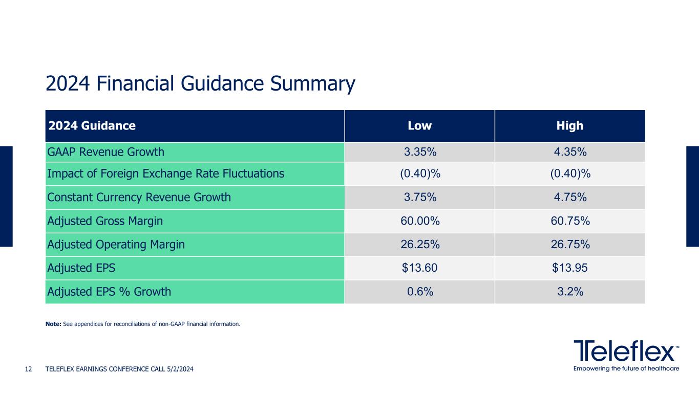 Q1'24 Financial Review TELEFLEX EARNINGS CONFERENCE CALL 5/2/202411 Gross margin Operating margin Global revenue growth Effective tax rate Earnings per share ◦ Revenue increased 3.8% year-over-year on a GAAP basis ◦ Revenue increased 3.8% year-over-year on a constant currency basis Note: See appendices for reconciliations of non-GAAP financial information. ◦ GAAP gross margin of 56.4% vs. 55.1% in the prior year period ◦ Adjusted gross margin of 61.1%, up 170 bps year-over-year ◦ GAAP operating margin of (0.6)% vs. 16.2% in prior year period ◦ Adjusted operating margin of 26.6%, up 80 bps year-over-year ◦ GAAP tax rate of 161.0% vs. 20.7% in prior year period ◦ Adjusted tax rate of 13.2% vs. 11.8% in prior year period ◦ GAAP EPS of $0.33 vs. $1.63 in prior year period ◦ Adjusted EPS of $3.21, up 3.9% year-over-year