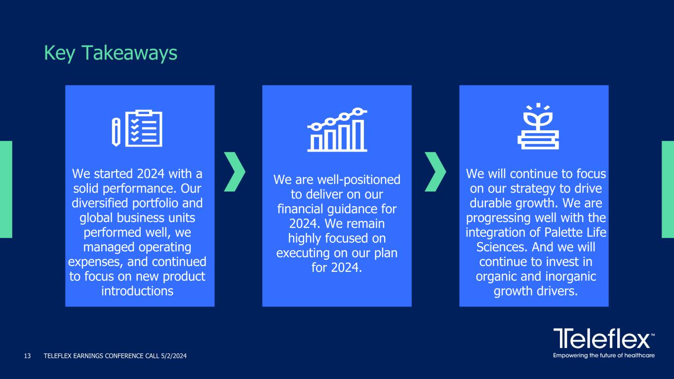 2024 Financial Guidance Summary TELEFLEX EARNINGS CONFERENCE CALL 5/2/202412 2024 Guidance Low High GAAP Revenue Growth 3.35% 4.35% Impact of Foreign Exchange Rate Fluctuations (0.40)% (0.40)% Constant Currency Revenue Growth 3.75% 4.75% Adjusted Gross Margin 60.00% 60.75% Adjusted Operating Margin 26.25% 26.75% Adjusted EPS $13.60 $13.95 Adjusted EPS % Growth 0.6% 3.2% Note: See appendices for reconciliations of non-GAAP financial information.