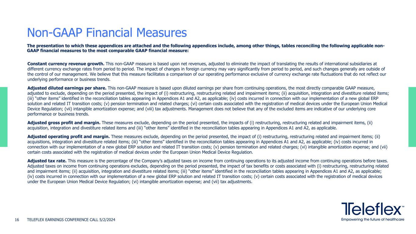 The presentation to which these appendices are attached and the following appendices include, among other things, tables reconciling the following applicable non- GAAP financial measures to the most comparable GAAP financial measure: Constant currency revenue growth. This non-GAAP measure is based upon net revenues, adjusted to eliminate the impact of translating the results of international subsidiaries at different currency exchange rates from period to period. The impact of changes in foreign currency may vary significantly from period to period, and such changes generally are outside of the control of our management. We believe that this measure facilitates a comparison of our operating performance exclusive of currency exchange rate fluctuations that do not reflect our underlying performance or business trends. Adjusted diluted earnings per share. This non-GAAP measure is based upon diluted earnings per share from continuing operations, the most directly comparable GAAP measure, adjusted to exclude, depending on the period presented, the impact of (i) restructuring, restructuring related and impairment items; (ii) acquisition, integration and divestiture related items; (iii) “other items” identified in the reconciliation tables appearing in Appendices A1 and A2, as applicable; (iv) costs incurred in connection with our implementation of a new global ERP solution and related IT transition costs; (v) pension termination and related charges; (vi) certain costs associated with the registration of medical devices under the European Union Medical Device Regulation; (vii) intangible amortization expense; and (viii) tax adjustments. Management does not believe that any of the excluded items are indicative of our underlying core performance or business trends. Adjusted gross profit and margin. These measures exclude, depending on the period presented, the impacts of (i) restructuring, restructuring related and impairment items, (ii) acquisition, integration and divestiture related items and (iii) “other items” identified in the reconciliation tables appearing in Appendices A1 and A2, as applicable. Adjusted operating profit and margin. These measures exclude, depending on the period presented, the impact of (i) restructuring, restructuring related and impairment items; (ii) acquisitions, integration and divestiture related items; (iii) “other items” identified in the reconciliation tables appearing in Appendices A1 and A2, as applicable; (iv) costs incurred in connection with our implementation of a new global ERP solution and related IT transition costs; (v) pension termination and related charges; (vi) intangible amortization expense; and (vii) certain costs associated with the registration of medical devices under the European Union Medical Device Regulation. Adjusted tax rate. This measure is the percentage of the Company’s adjusted taxes on income from continuing operations to its adjusted income from continuing operations before taxes. Adjusted taxes on income from continuing operations excludes, depending on the period presented, the impact of tax benefits or costs associated with (i) restructuring, restructuring related and impairment items; (ii) acquisition, integration and divestiture related items; (iii) “other items” identified in the reconciliation tables appearing in Appendices A1 and A2, as applicable; (iv) costs incurred in connection with our implementation of a new global ERP solution and related IT transition costs; (v) certain costs associated with the registration of medical devices under the European Union Medical Device Regulation; (vi) intangible amortization expense; and (vii) tax adjustments. Non-GAAP Financial Measures TELEFLEX EARNINGS CONFERENCE CALL 5/2/202416