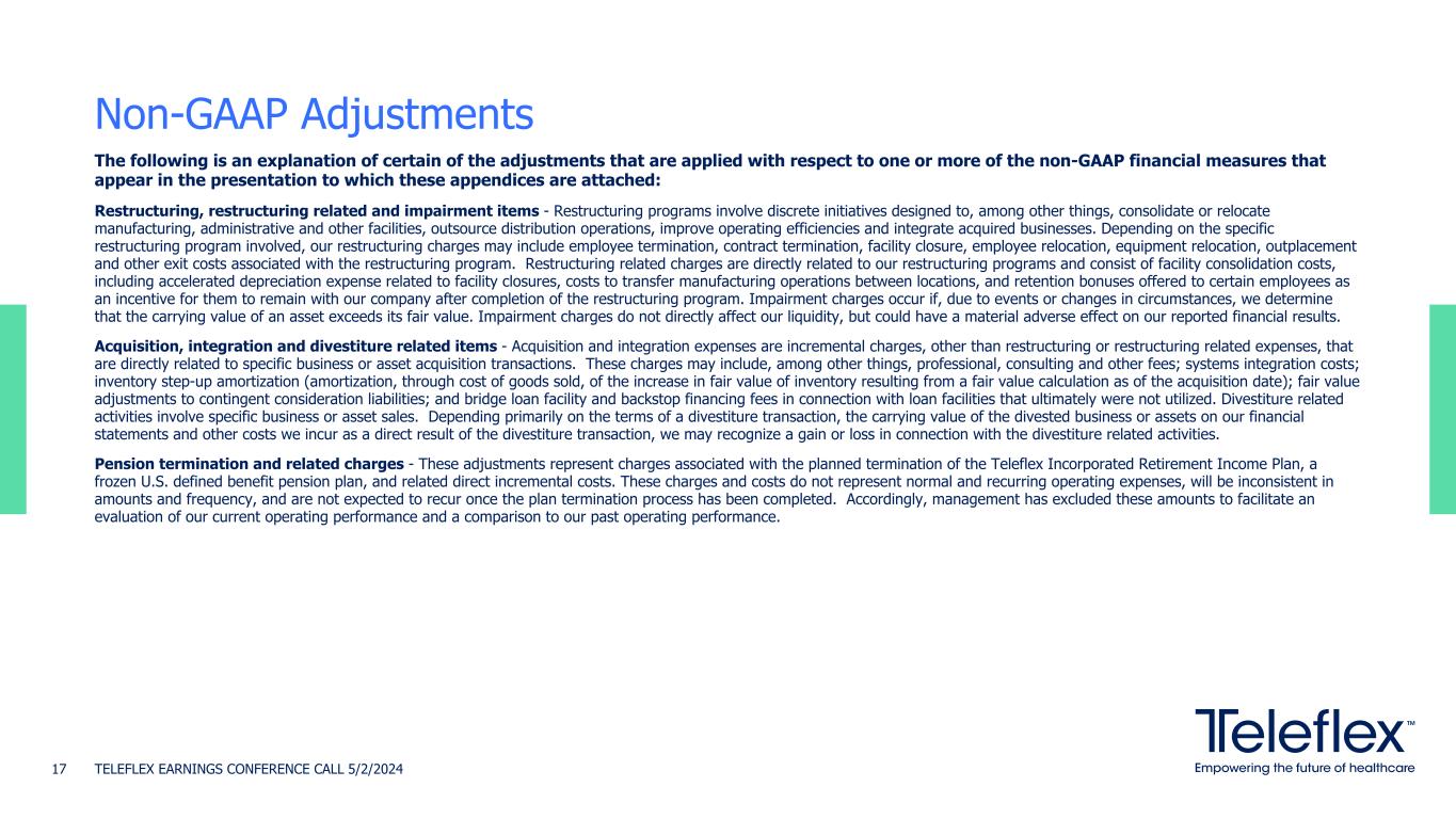 The following is an explanation of certain of the adjustments that are applied with respect to one or more of the non-GAAP financial measures that appear in the presentation to which these appendices are attached: Restructuring, restructuring related and impairment items - Restructuring programs involve discrete initiatives designed to, among other things, consolidate or relocate manufacturing, administrative and other facilities, outsource distribution operations, improve operating efficiencies and integrate acquired businesses. Depending on the specific restructuring program involved, our restructuring charges may include employee termination, contract termination, facility closure, employee relocation, equipment relocation, outplacement and other exit costs associated with the restructuring program. Restructuring related charges are directly related to our restructuring programs and consist of facility consolidation costs, including accelerated depreciation expense related to facility closures, costs to transfer manufacturing operations between locations, and retention bonuses offered to certain employees as an incentive for them to remain with our company after completion of the restructuring program. Impairment charges occur if, due to events or changes in circumstances, we determine that the carrying value of an asset exceeds its fair value. Impairment charges do not directly affect our liquidity, but could have a material adverse effect on our reported financial results. Acquisition, integration and divestiture related items - Acquisition and integration expenses are incremental charges, other than restructuring or restructuring related expenses, that are directly related to specific business or asset acquisition transactions. These charges may include, among other things, professional, consulting and other fees; systems integration costs; inventory step-up amortization (amortization, through cost of goods sold, of the increase in fair value of inventory resulting from a fair value calculation as of the acquisition date); fair value adjustments to contingent consideration liabilities; and bridge loan facility and backstop financing fees in connection with loan facilities that ultimately were not utilized. Divestiture related activities involve specific business or asset sales. Depending primarily on the terms of a divestiture transaction, the carrying value of the divested business or assets on our financial statements and other costs we incur as a direct result of the divestiture transaction, we may recognize a gain or loss in connection with the divestiture related activities. Pension termination and related charges - These adjustments represent charges associated with the planned termination of the Teleflex Incorporated Retirement Income Plan, a frozen U.S. defined benefit pension plan, and related direct incremental costs. These charges and costs do not represent normal and recurring operating expenses, will be inconsistent in amounts and frequency, and are not expected to recur once the plan termination process has been completed. Accordingly, management has excluded these amounts to facilitate an evaluation of our current operating performance and a comparison to our past operating performance. Non-GAAP Adjustments TELEFLEX EARNINGS CONFERENCE CALL 5/2/202417