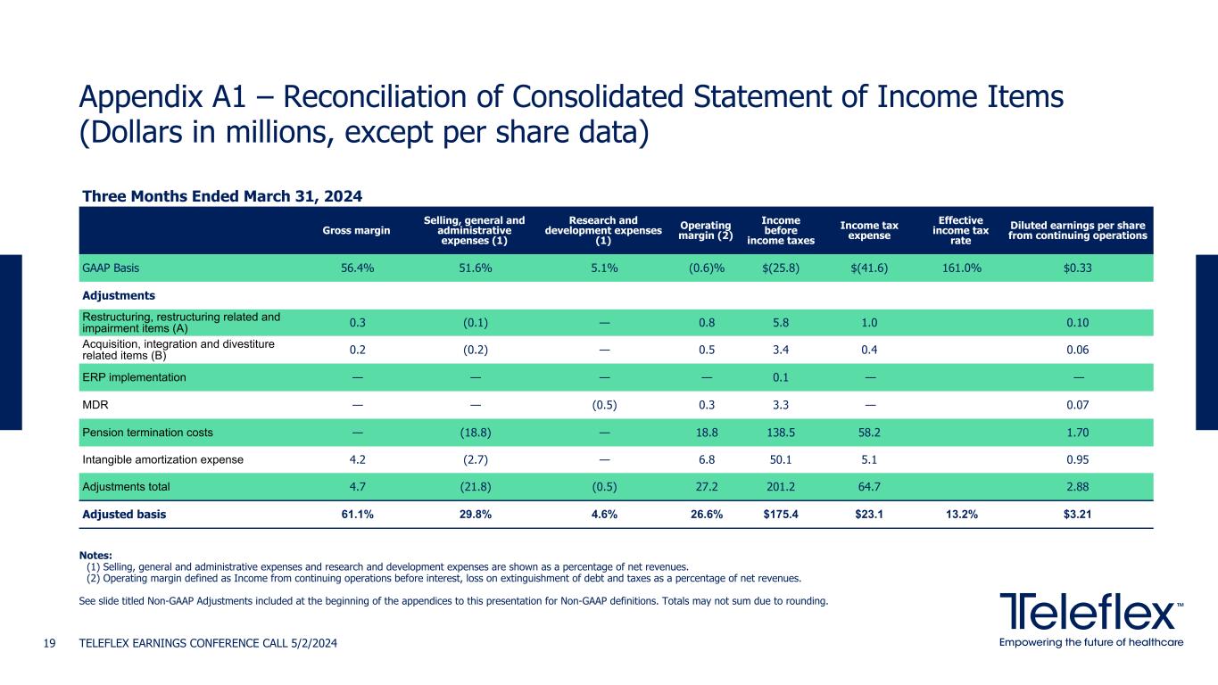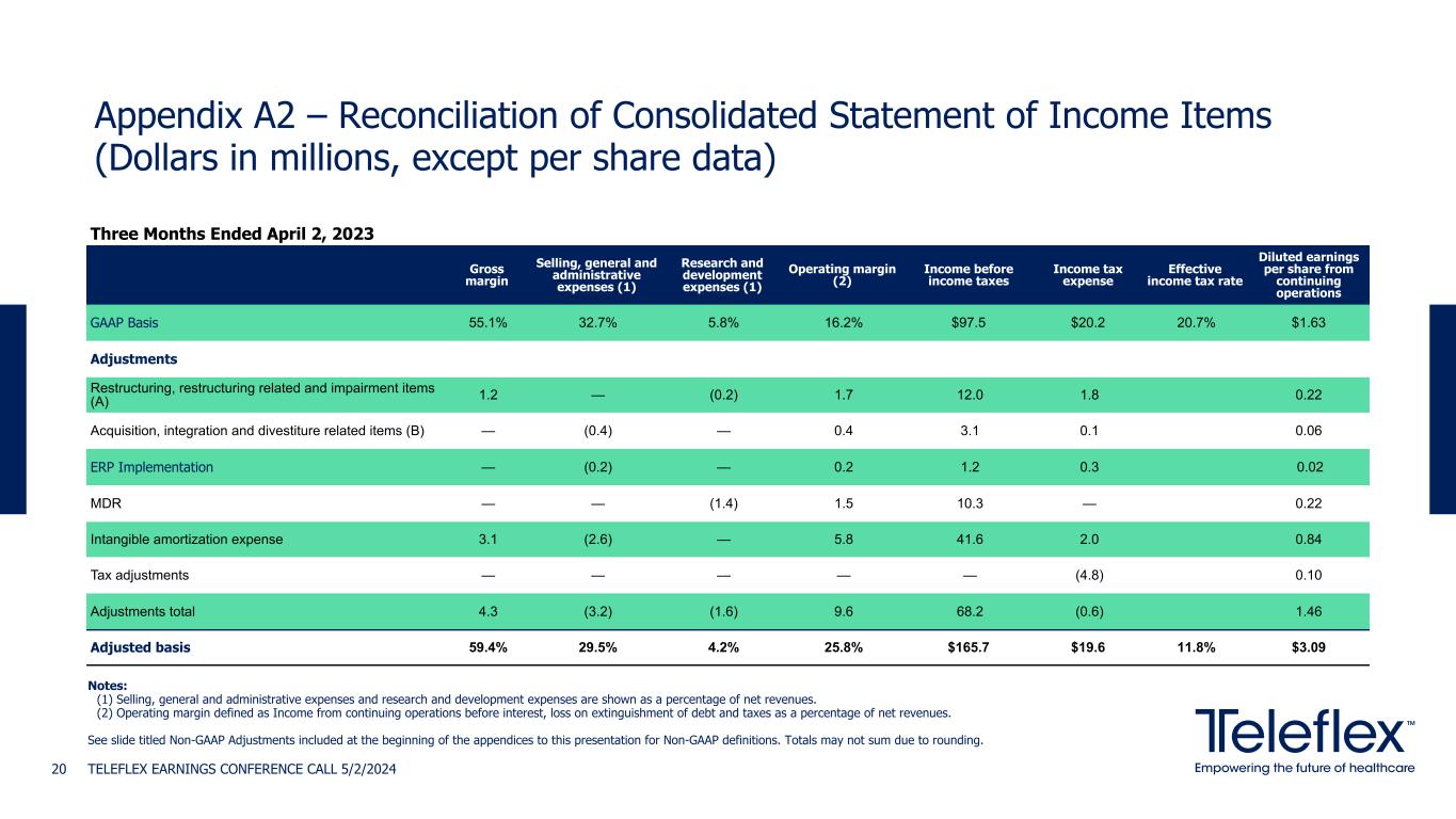 Appendix A1 – Reconciliation of Consolidated Statement of Income Items (Dollars in millions, except per share data) TELEFLEX EARNINGS CONFERENCE CALL 5/2/202419 Three Months Ended March 31, 2024 Gross margin Selling, general and administrative expenses (1) Research and development expenses (1) Operating margin (2) Income before income taxes Income tax expense Effective income tax rate Diluted earnings per share from continuing operations GAAP Basis 56.4% 51.6% 5.1% (0.6)% $(25.8) $(41.6) 161.0% $0.33 Adjustments Restructuring, restructuring related and impairment items (A) 0.3 (0.1) — 0.8 5.8 1.0 0.10 Acquisition, integration and divestiture related items (B) 0.2 (0.2) — 0.5 3.4 0.4 0.06 ERP implementation — — — — 0.1 — — MDR — — (0.5) 0.3 3.3 — 0.07 Pension termination costs — (18.8) — 18.8 138.5 58.2 1.70 Intangible amortization expense 4.2 (2.7) — 6.8 50.1 5.1 0.95 Adjustments total 4.7 (21.8) (0.5) 27.2 201.2 64.7 2.88 Adjusted basis 61.1% 29.8% 4.6% 26.6% $175.4 $23.1 13.2% $3.21 Notes: (1) Selling, general and administrative expenses and research and development expenses are shown as a percentage of net revenues. (2) Operating margin defined as Income from continuing operations before interest, loss on extinguishment of debt and taxes as a percentage of net revenues. See slide titled Non-GAAP Adjustments included at the beginning of the appendices to this presentation for Non-GAAP definitions. Totals may not sum due to rounding.