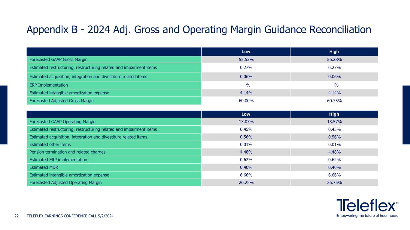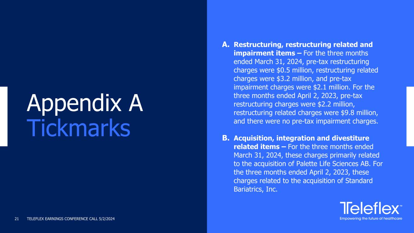 TELEFLEX EARNINGS CONFERENCE CALL 5/2/202421 A. Restructuring, restructuring related and impairment items – For the three months ended March 31, 2024, pre-tax restructuring charges were $0.5 million, restructuring related charges were $3.2 million, and pre-tax impairment charges were $2.1 million. For the three months ended April 2, 2023, pre-tax restructuring charges were $2.2 million, restructuring related charges were $9.8 million, and there were no pre-tax impairment charges. B. Acquisition, integration and divestiture related items – For the three months ended March 31, 2024, these charges primarily related to the acquisition of Palette Life Sciences AB. For the three months ended April 2, 2023, these charges related to the acquisition of Standard Bariatrics, Inc. Appendix A Tickmarks