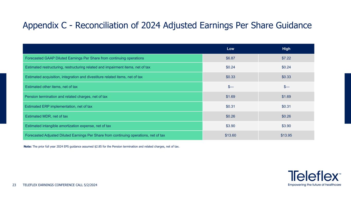 Appendix B - 2024 Adj. Gross and Operating Margin Guidance Reconciliation TELEFLEX EARNINGS CONFERENCE CALL 5/2/202422 Low High Forecasted GAAP Gross Margin 55.53% 56.28% Estimated restructuring, restructuring related and impairment items 0.27% 0.27% Estimated acquisition, integration and divestiture related items 0.06% 0.06% ERP Implementation —% —% Estimated intangible amortization expense 4.14% 4.14% Forecasted Adjusted Gross Margin 60.00% 60.75% Low High Forecasted GAAP Operating Margin 13.07% 13.57% Estimated restructuring, restructuring related and impairment items 0.45% 0.45% Estimated acquisition, integration and divestiture related items 0.56% 0.56% Estimated other items 0.01% 0.01% Pension termination and related charges 4.48% 4.48% Estimated ERP implementation 0.62% 0.62% Estimated MDR 0.40% 0.40% Estimated intangible amortization expense 6.66% 6.66% Forecasted Adjusted Operating Margin 26.25% 26.75%