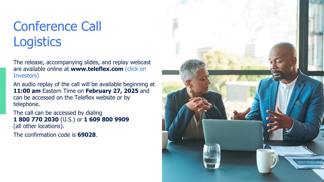 The release, accompanying slides, and replay webcast are available online at www.teleflex.com (click on Investors) An audio replay of the call will be available beginning at 11:00 am Eastern Time on February 27, 2025 and can be accessed on the Teleflex website or by telephone. The call can be accessed by dialing 1 800 770 2030 (U.S.) or 1 609 800 9909 (all other locations). The confirmation code is 69028. Conference Call Logistics