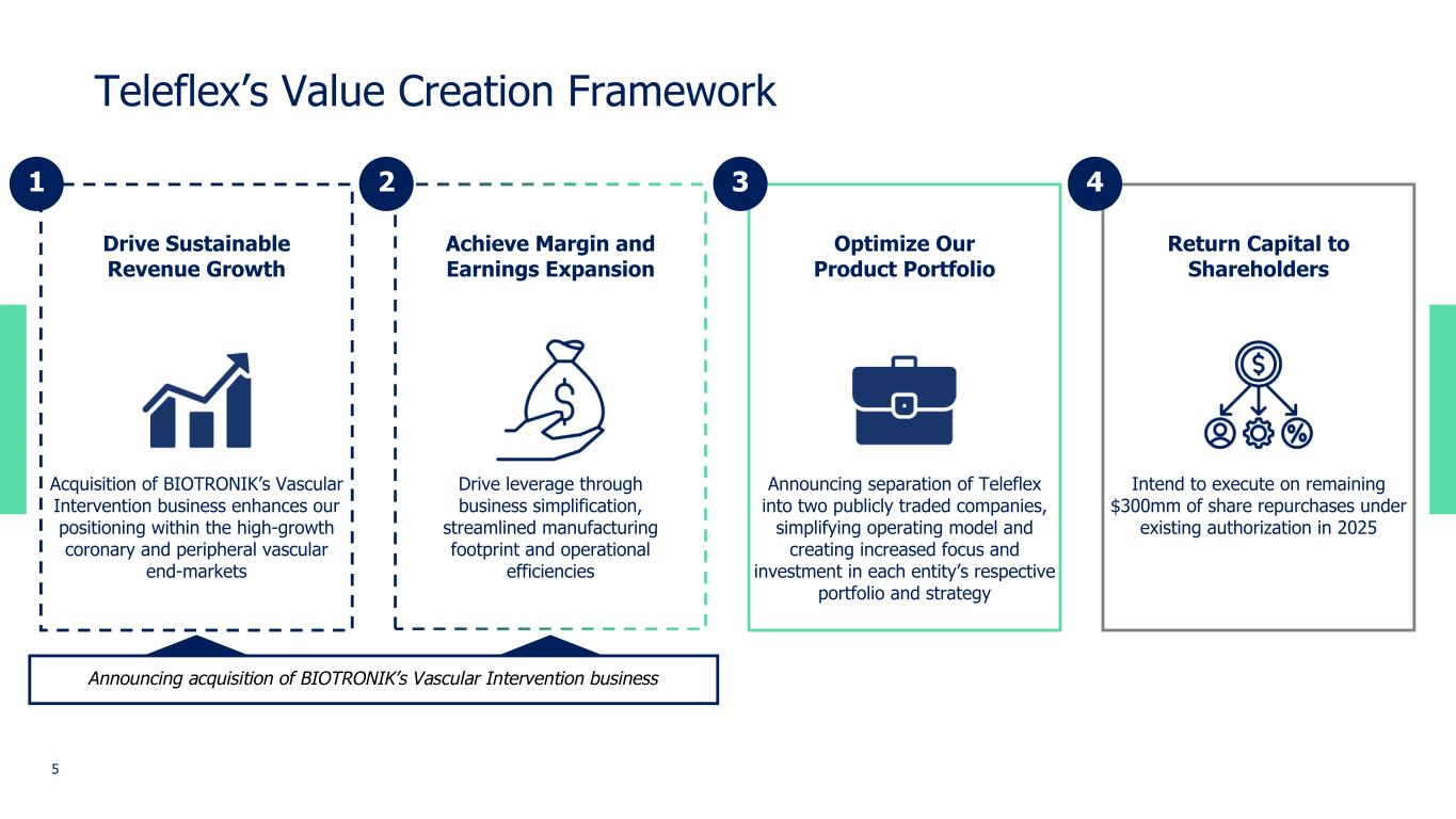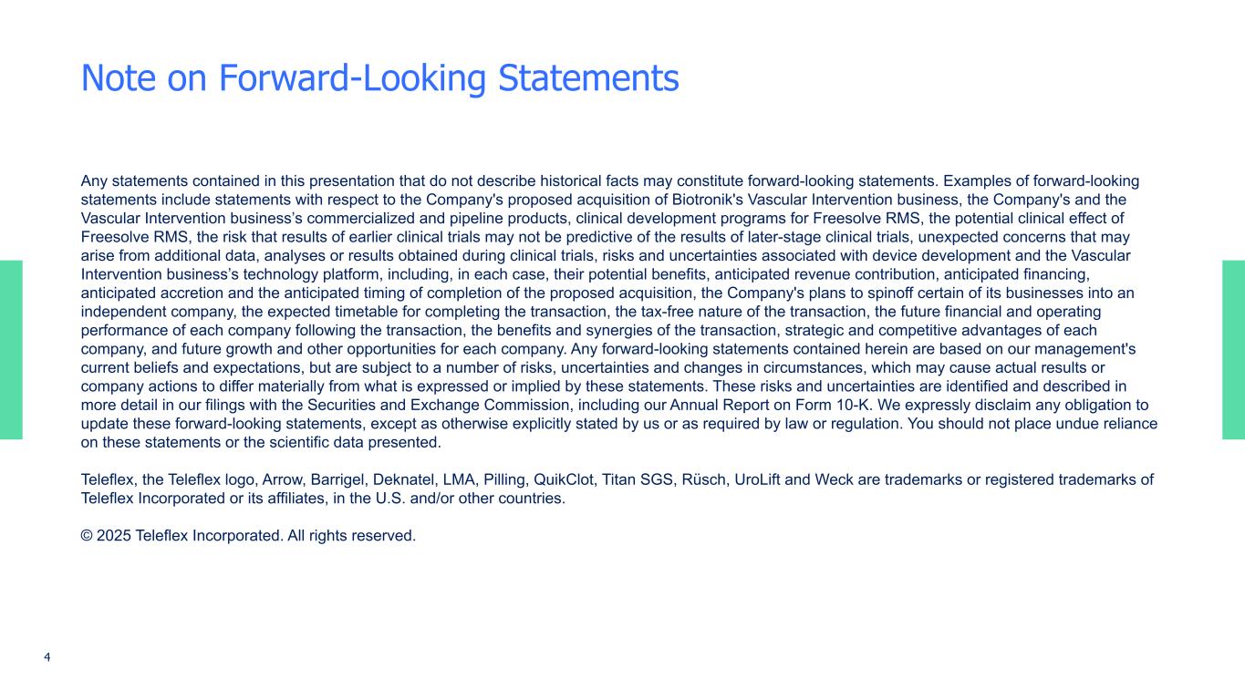 Any statements contained in this presentation that do not describe historical facts may constitute forward-looking statements. Examples of forward-looking statements include statements with respect to the Company's proposed acquisition of Biotronik's Vascular Intervention business, the Company's and the Vascular Intervention business’s commercialized and pipeline products, clinical development programs for Freesolve RMS, the potential clinical effect of Freesolve RMS, the risk that results of earlier clinical trials may not be predictive of the results of later-stage clinical trials, unexpected concerns that may arise from additional data, analyses or results obtained during clinical trials, risks and uncertainties associated with device development and the Vascular Intervention business’s technology platform, including, in each case, their potential benefits, anticipated revenue contribution, anticipated financing, anticipated accretion and the anticipated timing of completion of the proposed acquisition, the Company's plans to spinoff certain of its businesses into an independent company, the expected timetable for completing the transaction, the tax-free nature of the transaction, the future financial and operating performance of each company following the transaction, the benefits and synergies of the transaction, strategic and competitive advantages of each company, and future growth and other opportunities for each company. Any forward-looking statements contained herein are based on our management's current beliefs and expectations, but are subject to a number of risks, uncertainties and changes in circumstances, which may cause actual results or company actions to differ materially from what is expressed or implied by these statements. These risks and uncertainties are identified and described in more detail in our filings with the Securities and Exchange Commission, including our Annual Report on Form 10-K. We expressly disclaim any obligation to update these forward-looking statements, except as otherwise explicitly stated by us or as required by law or regulation. You should not place undue reliance on these statements or the scientific data presented. Teleflex, the Teleflex logo, Arrow, Barrigel, Deknatel, LMA, Pilling, QuikClot, Titan SGS, Rüsch, UroLift and Weck are trademarks or registered trademarks of Teleflex Incorporated or its affiliates, in the U.S. and/or other countries. © 2025 Teleflex Incorporated. All rights reserved. Note on Forward-Looking Statements 4