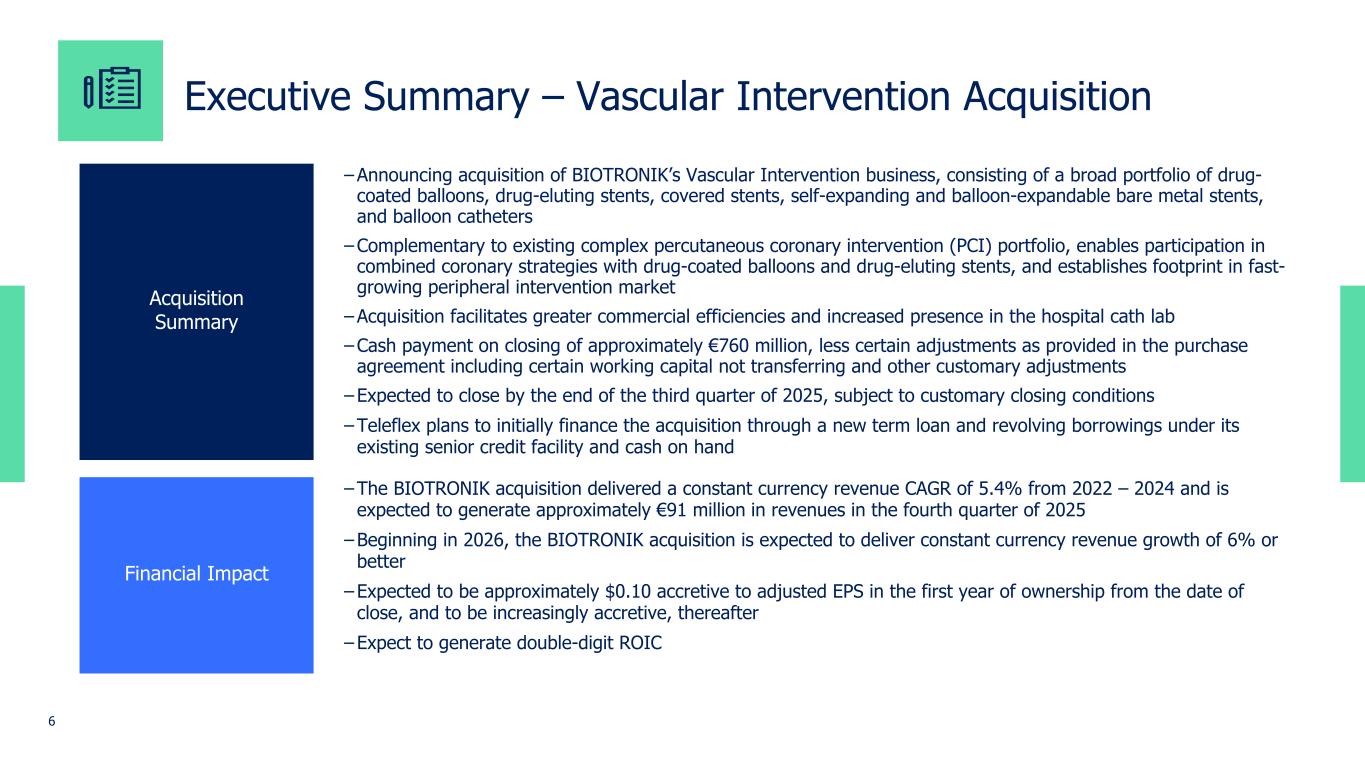 5 Teleflex’s Value Creation Framework 1 2 3 Drive Sustainable Revenue Growth Acquisition of BIOTRONIK’s Vascular Intervention business enhances our positioning within the high-growth coronary and peripheral vascular end-markets Achieve Margin and Earnings Expansion Drive leverage through business simplification, streamlined manufacturing footprint and operational efficiencies Optimize Our Product Portfolio Announcing separation of Teleflex into two publicly traded companies, simplifying operating model and creating increased focus and investment in each entity’s respective portfolio and strategy Announcing acquisition of BIOTRONIK’s Vascular Intervention business 4 Intend to execute on remaining $300mm of share repurchases under existing authorization in 2025 Return Capital to Shareholders