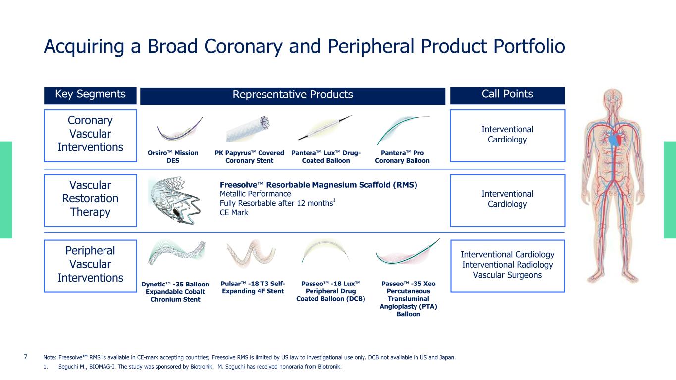 Executive Summary – Vascular Intervention Acquisition 6 Acquisition Summary Financial Impact –Announcing acquisition of BIOTRONIK’s Vascular Intervention business, consisting of a broad portfolio of drug- coated balloons, drug-eluting stents, covered stents, self-expanding and balloon-expandable bare metal stents, and balloon catheters –Complementary to existing complex percutaneous coronary intervention (PCI) portfolio, enables participation in combined coronary strategies with drug-coated balloons and drug-eluting stents, and establishes footprint in fast- growing peripheral intervention market –Acquisition facilitates greater commercial efficiencies and increased presence in the hospital cath lab –Cash payment on closing of approximately €760 million, less certain adjustments as provided in the purchase agreement including certain working capital not transferring and other customary adjustments –Expected to close by the end of the third quarter of 2025, subject to customary closing conditions –Teleflex plans to initially finance the acquisition through a new term loan and revolving borrowings under its existing senior credit facility and cash on hand –The BIOTRONIK acquisition delivered a constant currency revenue CAGR of 5.4% from 2022 – 2024 and is expected to generate approximately €91 million in revenues in the fourth quarter of 2025 –Beginning in 2026, the BIOTRONIK acquisition is expected to deliver constant currency revenue growth of 6% or better –Expected to be approximately $0.10 accretive to adjusted EPS in the first year of ownership from the date of close, and to be increasingly accretive, thereafter –Expect to generate double-digit ROIC