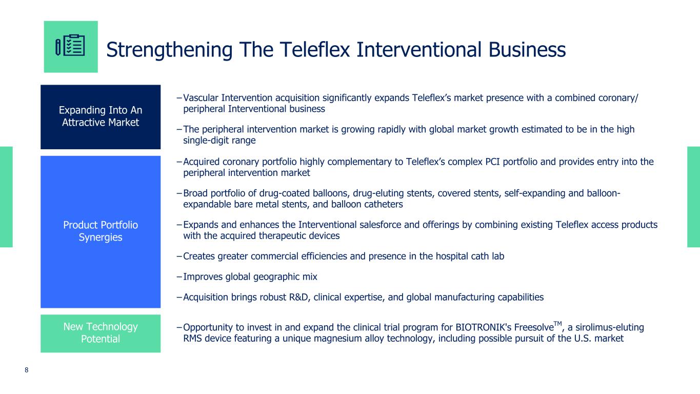 Acquiring a Broad Coronary and Peripheral Product Portfolio 7 Key Segments Representative Products Call Points Orsiro™ Mission DES PK Papyrus™ Covered Coronary Stent Pantera™ Lux™ Drug- Coated Balloon Pantera™ Pro Coronary Balloon Interventional Cardiology Freesolve™ Resorbable Magnesium Scaffold (RMS) Metallic Performance Fully Resorbable after 12 months1 CE Mark Dynetic™ -35 Balloon Expandable Cobalt Chronium Stent Pulsar™ -18 T3 Self- Expanding 4F Stent Passeo™ -18 Lux™ Peripheral Drug Coated Balloon (DCB) Passeo™ -35 Xeo Percutaneous Transluminal Angioplasty (PTA) Balloon Coronary Vascular Interventions Vascular Restoration Therapy Interventional Cardiology Interventional Radiology Vascular Surgeons Peripheral Vascular Interventions Interventional Cardiology Note: Freesolve™ RMS is available in CE-mark accepting countries; Freesolve RMS is limited by US law to investigational use only. DCB not available in US and Japan. 1. Seguchi M., BIOMAG-I. The study was sponsored by Biotronik. M. Seguchi has received honoraria from Biotronik.