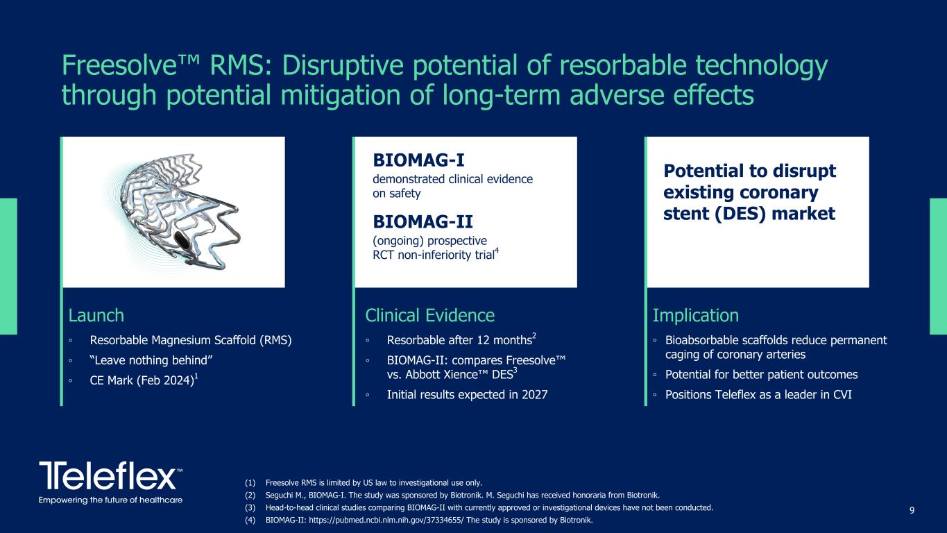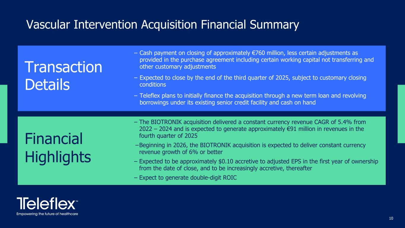 9 Implication ◦ Bioabsorbable scaffolds reduce permanent caging of coronary arteries ◦ Potential for better patient outcomes ◦ Positions Teleflex as a leader in CVI Clinical Evidence ◦ Resorbable after 12 months2 ◦ BIOMAG-II: compares Freesolve™ vs. Abbott Xience™ DES3 ◦ Initial results expected in 2027 Launch ◦ Resorbable Magnesium Scaffold (RMS) ◦ “Leave nothing behind” ◦ CE Mark (Feb 2024)1 Freesolve™ RMS: Disruptive potential of resorbable technology through potential mitigation of long-term adverse effects BIOMAG-I demonstrated clinical evidence on safety BIOMAG-II (ongoing) prospective RCT non-inferiority trial4 Potential to disrupt existing coronary stent (DES) market (1) Freesolve RMS is limited by US law to investigational use only. (2) Seguchi M., BIOMAG-I. The study was sponsored by Biotronik. M. Seguchi has received honoraria from Biotronik. (3) Head-to-head clinical studies comparing BIOMAG-II with currently approved or investigational devices have not been conducted. (4) BIOMAG-II: https://pubmed.ncbi.nlm.nih.gov/37334655/ The study is sponsored by Biotronik.
