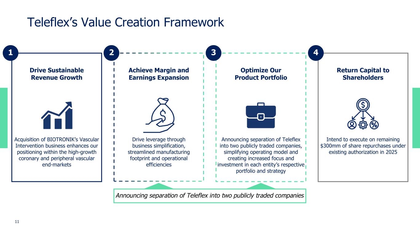 Transaction Details – The BIOTRONIK acquisition delivered a constant currency revenue CAGR of 5.4% from 2022 – 2024 and is expected to generate approximately €91 million in revenues in the fourth quarter of 2025 –Beginning in 2026, the BIOTRONIK acquisition is expected to deliver constant currency revenue growth of 6% or better – Expected to be approximately $0.10 accretive to adjusted EPS in the first year of ownership from the date of close, and to be increasingly accretive, thereafter – Expect to generate double-digit ROIC – Cash payment on closing of approximately €760 million, less certain adjustments as provided in the purchase agreement including certain working capital not transferring and other customary adjustments – Expected to close by the end of the third quarter of 2025, subject to customary closing conditions – Teleflex plans to initially finance the acquisition through a new term loan and revolving borrowings under its existing senior credit facility and cash on hand Financial Highlights Vascular Intervention Acquisition Financial Summary 10