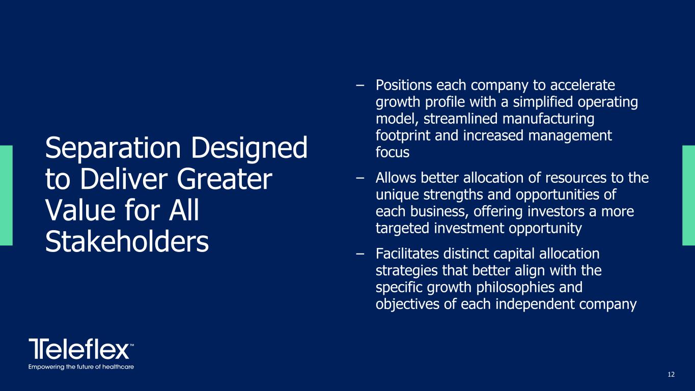 11 Teleflex’s Value Creation Framework 1 2 3 Drive Sustainable Revenue Growth Acquisition of BIOTRONIK’s Vascular Intervention business enhances our positioning within the high-growth coronary and peripheral vascular end-markets Achieve Margin and Earnings Expansion Drive leverage through business simplification, streamlined manufacturing footprint and operational efficiencies Optimize Our Product Portfolio Announcing separation of Teleflex into two publicly traded companies, simplifying operating model and creating increased focus and investment in each entity’s respective portfolio and strategy 4 Return Capital to Shareholders Announcing separation of Teleflex into two publicly traded companies Intend to execute on remaining $300mm of share repurchases under existing authorization in 2025