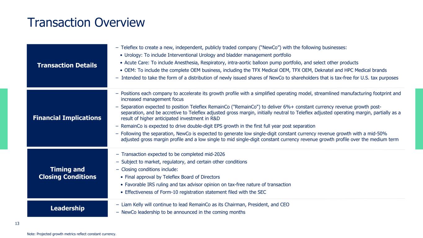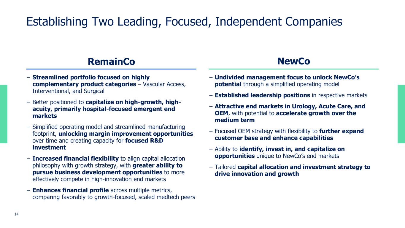 13 Transaction Details Financial Implications Timing and Closing Conditions – Transaction expected to be completed mid-2026 – Subject to market, regulatory, and certain other conditions – Closing conditions include: • Final approval by Teleflex Board of Directors • Favorable IRS ruling and tax advisor opinion on tax-free nature of transaction • Effectiveness of Form-10 registration statement filed with the SEC – Teleflex to create a new, independent, publicly traded company (“NewCo”) with the following businesses: • Urology: To include Interventional Urology and bladder management portfolio • Acute Care: To include Anesthesia, Respiratory, intra-aortic balloon pump portfolio, and select other products • OEM: To include the complete OEM business, including the TFX Medical OEM, TFX OEM, Deknatel and HPC Medical brands – Intended to take the form of a distribution of newly issued shares of NewCo to shareholders that is tax-free for U.S. tax purposes – Positions each company to accelerate its growth profile with a simplified operating model, streamlined manufacturing footprint and increased management focus – Separation expected to position Teleflex RemainCo ("RemainCo") to deliver 6%+ constant currency revenue growth post- separation, and be accretive to Teleflex adjusted gross margin, initially neutral to Teleflex adjusted operating margin, partially as a result of higher anticipated investment in R&D – RemainCo is expected to drive double-digit EPS growth in the first full year post separation – Following the separation, NewCo is expected to generate low single-digit constant currency revenue growth with a mid-50% adjusted gross margin profile and a low single to mid single-digit constant currency revenue growth profile over the medium term Leadership – Liam Kelly will continue to lead RemainCo as its Chairman, President, and CEO – NewCo leadership to be announced in the coming months Transaction Overview Note: Projected growth metrics reflect constant currency.