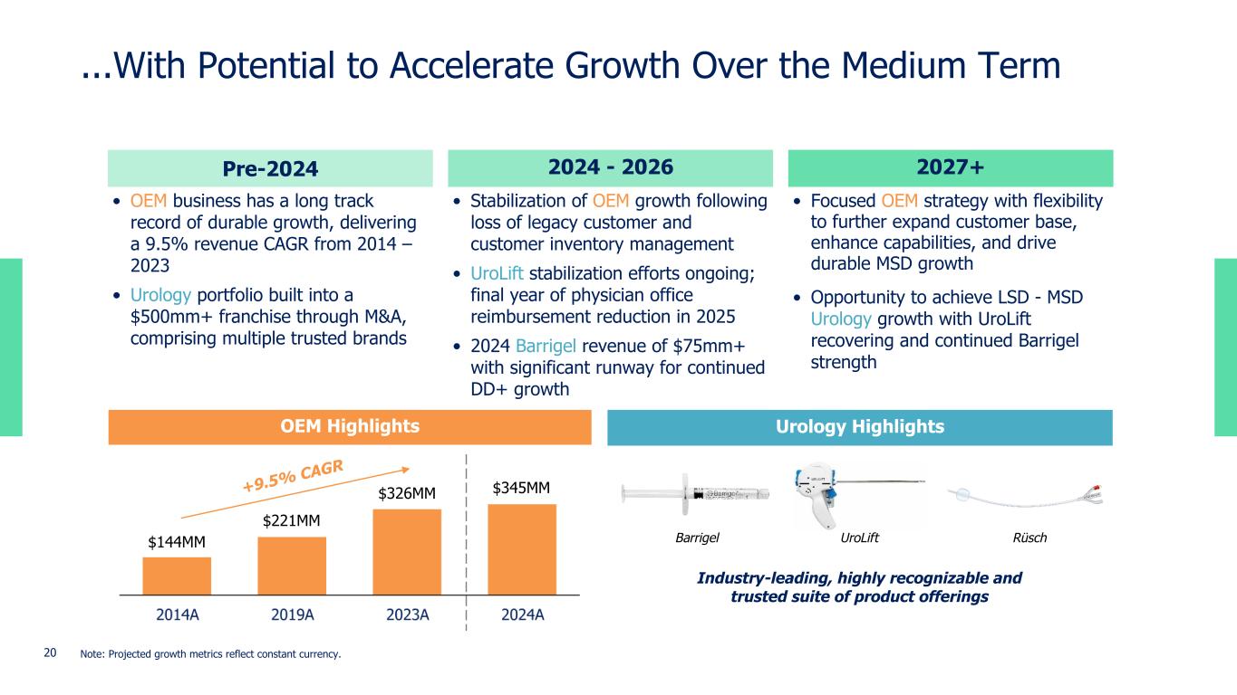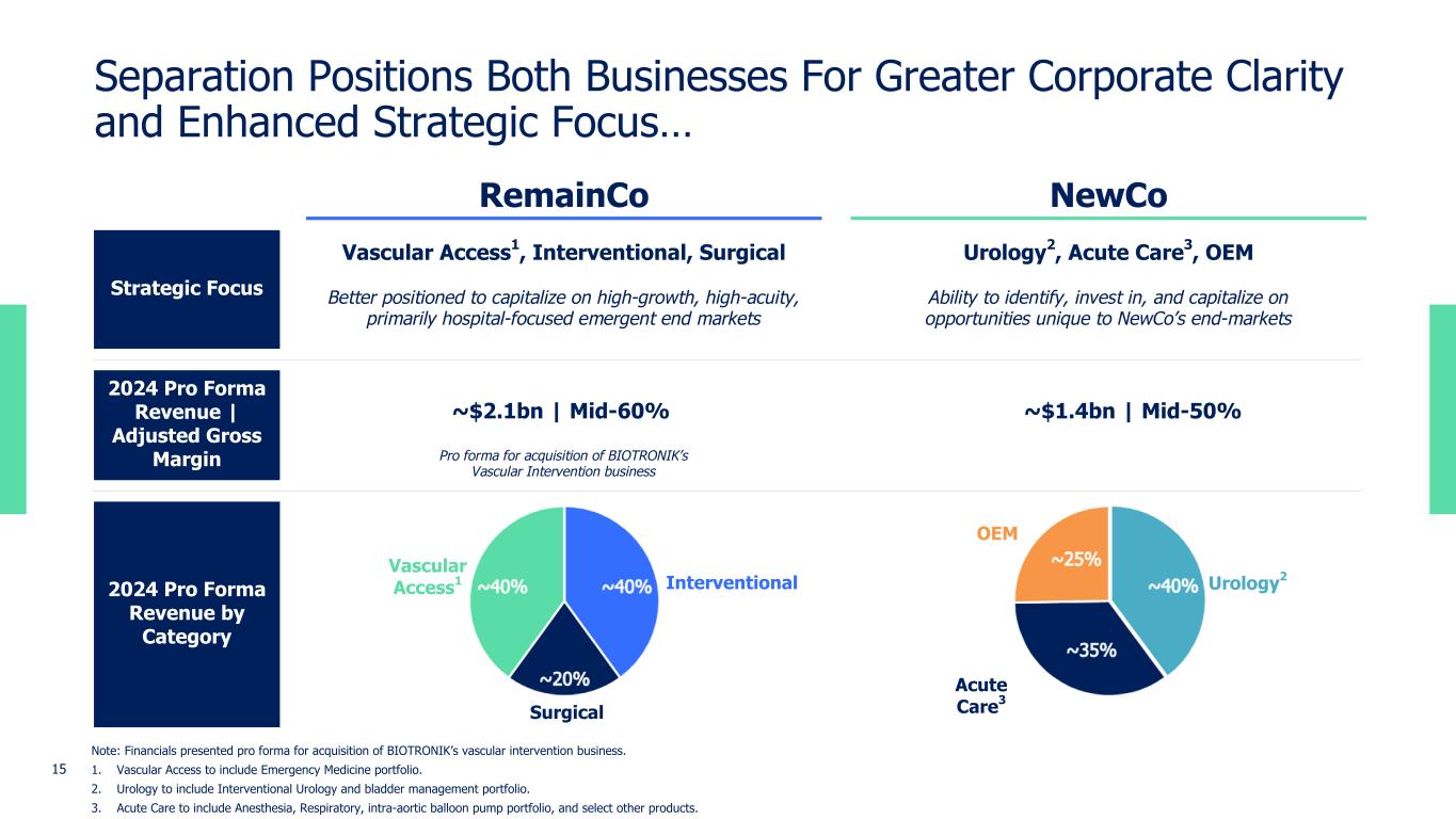 14 Establishing Two Leading, Focused, Independent Companies NewCo – Streamlined portfolio focused on highly complementary product categories – Vascular Access, Interventional, and Surgical – Better positioned to capitalize on high-growth, high- acuity, primarily hospital-focused emergent end markets – Simplified operating model and streamlined manufacturing footprint, unlocking margin improvement opportunities over time and creating capacity for focused R&D investment – Increased financial flexibility to align capital allocation philosophy with growth strategy, with greater ability to pursue business development opportunities to more effectively compete in high-innovation end markets – Enhances financial profile across multiple metrics, comparing favorably to growth-focused, scaled medtech peers – Undivided management focus to unlock NewCo’s potential through a simplified operating model – Established leadership positions in respective markets – Attractive end markets in Urology, Acute Care, and OEM, with potential to accelerate growth over the medium term – Focused OEM strategy with flexibility to further expand customer base and enhance capabilities – Ability to identify, invest in, and capitalize on opportunities unique to NewCo’s end markets – Tailored capital allocation and investment strategy to drive innovation and growth RemainCo