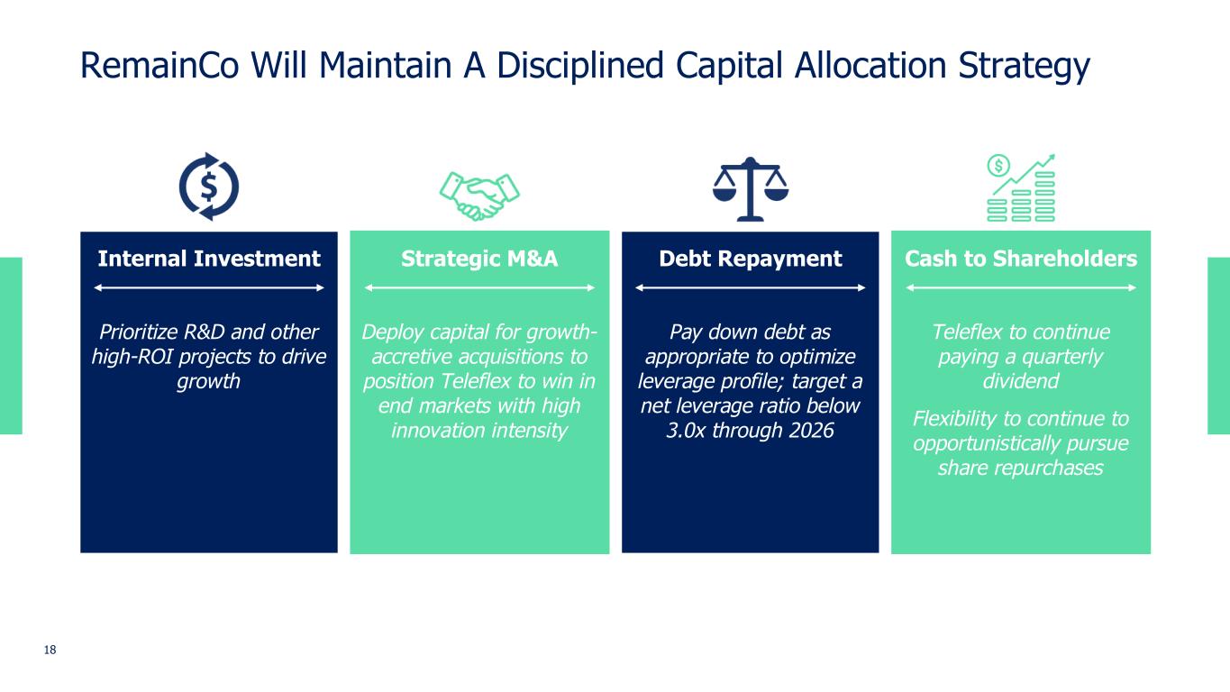 Key Sites of Care / Call Points 17 RemainCo to Focus on Highly Complementary Product Categories Primarily Within Hospital-Focused End Markets Vascular Access Surgical Interventional Market Served1 Market Growth1 $4bn2 $10bn $18bn MSD MSD+ MSD+ 6%+ constant currency revenue growth Accretive to Teleflex adjusted gross margin Intensive Care Unit Emergency Medicine Interventional Cardiology Interventional Radiology Vascular Surgery Hospital Surgical Suite Operating Room Robotic, Bariatric and MIS Procedures Double-Digit EPS growth in the first full year post separation Post-Separation Note: Projected growth metrics reflect constant currency. (1) Based on market data and internal Teleflex estimates of markets served. (2) Excludes Emergency Medicine. (3) Neutral to adjusted operating margin partially as a result of higher anticipated investment in R&D. RemainCo Simplified operating model Neutral to Teleflex adjusted operating margin 3