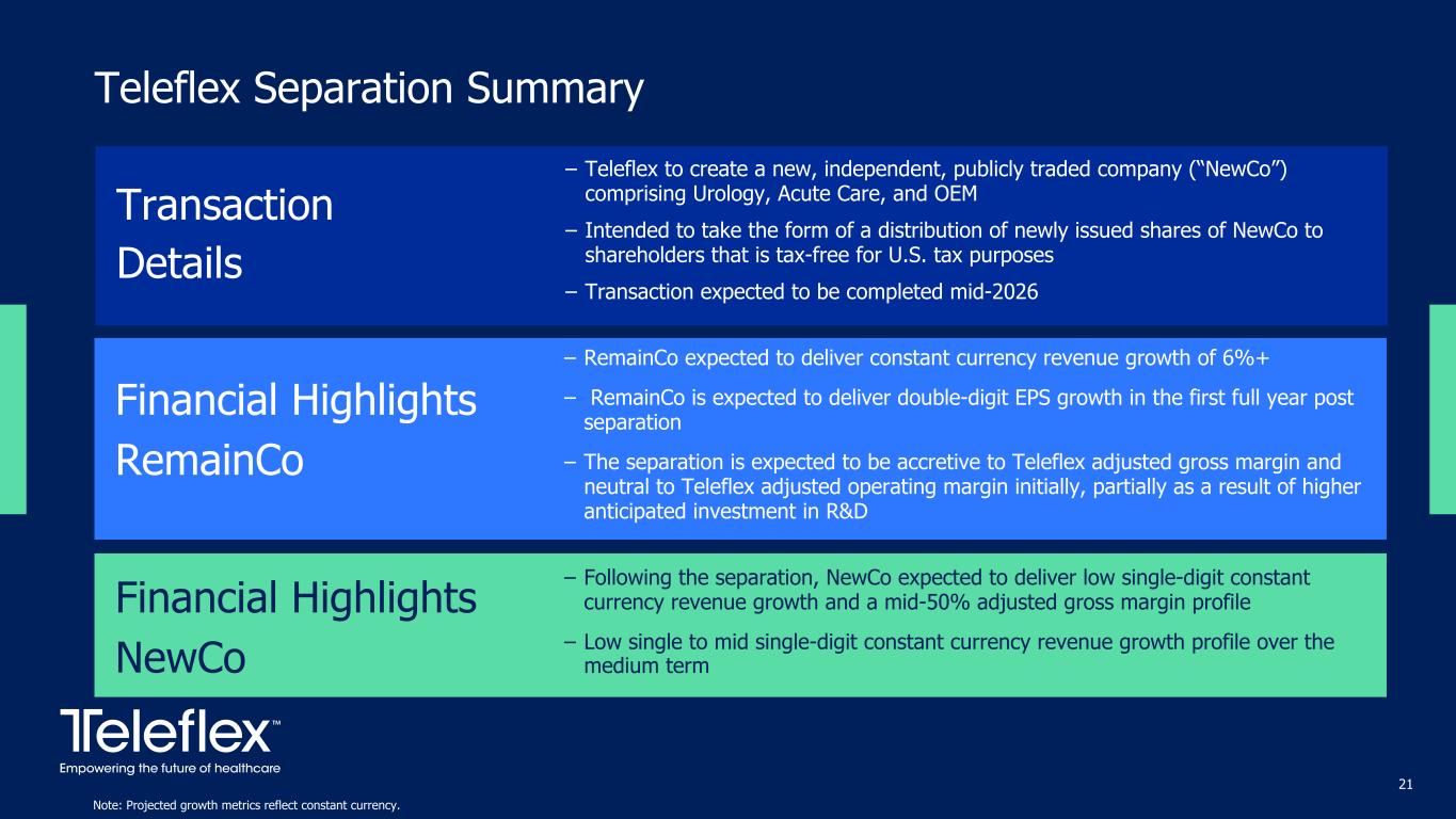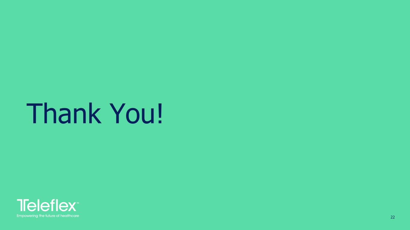 Transaction Details – Teleflex to create a new, independent, publicly traded company (“NewCo”) comprising Urology, Acute Care, and OEM – Intended to take the form of a distribution of newly issued shares of NewCo to shareholders that is tax-free for U.S. tax purposes – Transaction expected to be completed mid-2026 Financial Highlights RemainCo Teleflex Separation Summary – RemainCo expected to deliver constant currency revenue growth of 6%+ – RemainCo is expected to deliver double-digit EPS growth in the first full year post separation – The separation is expected to be accretive to Teleflex adjusted gross margin and neutral to Teleflex adjusted operating margin initially, partially as a result of higher anticipated investment in R&D Financial Highlights NewCo – Following the separation, NewCo expected to deliver low single-digit constant currency revenue growth and a mid-50% adjusted gross margin profile – Low single to mid single-digit constant currency revenue growth profile over the medium term Note: Projected growth metrics reflect constant currency. 21