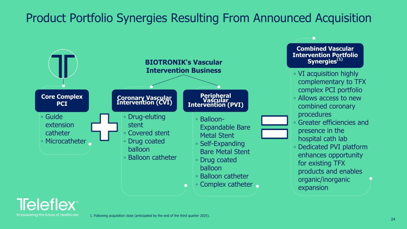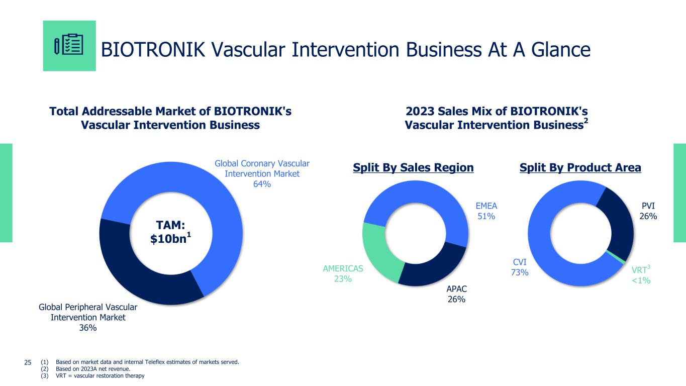 ◦ Guide extension catheter ◦ Microcatheter Core Complex PCI Peripheral Vascular Intervention (PVI) Coronary Vascular Intervention (CVI) ◦ Balloon- Expandable Bare Metal Stent ◦ Self-Expanding Bare Metal Stent ◦ Drug coated balloon ◦ Balloon catheter ◦ Complex catheter ◦ Drug-eluting stent ◦ Covered stent ◦ Drug coated balloon ◦ Balloon catheter BIOTRONIK's Vascular Intervention Business Combined Vascular Intervention Portfolio Synergies(1) ◦ VI acquisition highly complementary to TFX complex PCI portfolio ◦ Allows access to new combined coronary procedures ◦ Greater efficiencies and presence in the hospital cath lab ◦ Dedicated PVI platform enhances opportunity for existing TFX products and enables organic/inorganic expansion Product Portfolio Synergies Resulting From Announced Acquisition 1. Following acquisition close (anticipated by the end of the third quarter 2025). 24