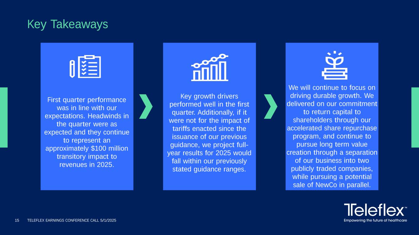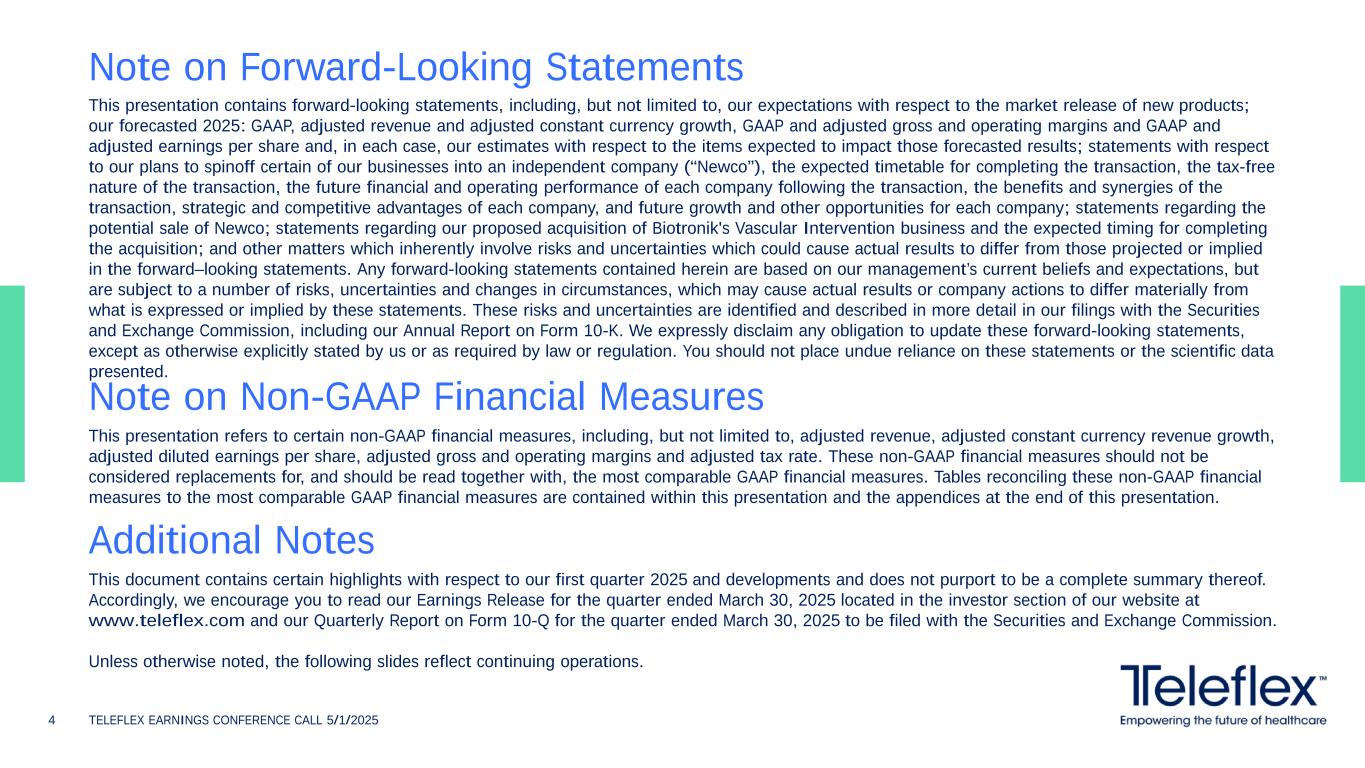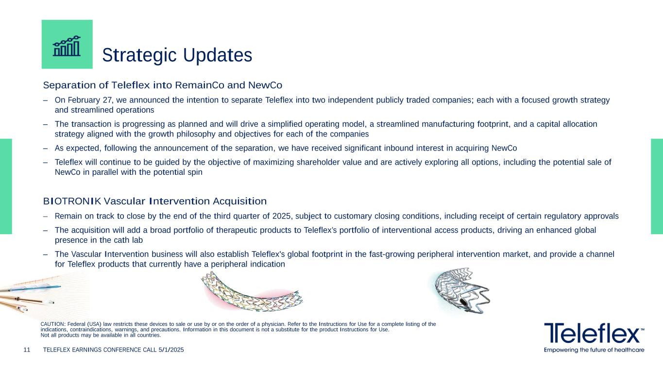 CAUTION: Federal (USA) law restricts these devices to sale or use by or on the order of a physician. Refer to the Instructions for Use for a complete listing of the indications, contraindications, warnings, and precautions. Information in this document is not a substitute for the product Instructions for Use. Not all products may be available in all countries. Separation of Teleflex into RemainCo and NewCo – On February 27, we announced the intention to separate Teleflex into two independent publicly traded companies; each with a focused growth strategy and streamlined operations – The transaction is progressing as planned and will drive a simplified operating model, a streamlined manufacturing footprint, and a capital allocation strategy aligned with the growth philosophy and objectives for each of the companies – As expected, following the announcement of the separation, we have received significant inbound interest in acquiring NewCo – Teleflex will continue to be guided by the objective of maximizing shareholder value and are actively exploring all options, including the potential sale of NewCo in parallel with the potential spin BIOTRONIK Vascular Intervention Acquisition – Remain on track to close by the end of the third quarter of 2025, subject to customary closing conditions, including receipt of certain regulatory approvals – The acquisition will add a broad portfolio of therapeutic products to Teleflex’s portfolio of interventional access products, driving an enhanced global presence in the cath lab – The Vascular Intervention business will also establish Teleflex's global footprint in the fast-growing peripheral intervention market, and provide a channel for Teleflex products that currently have a peripheral indication Strategic Updates TELEFLEX EARNINGS CONFERENCE CALL 5/1/202511