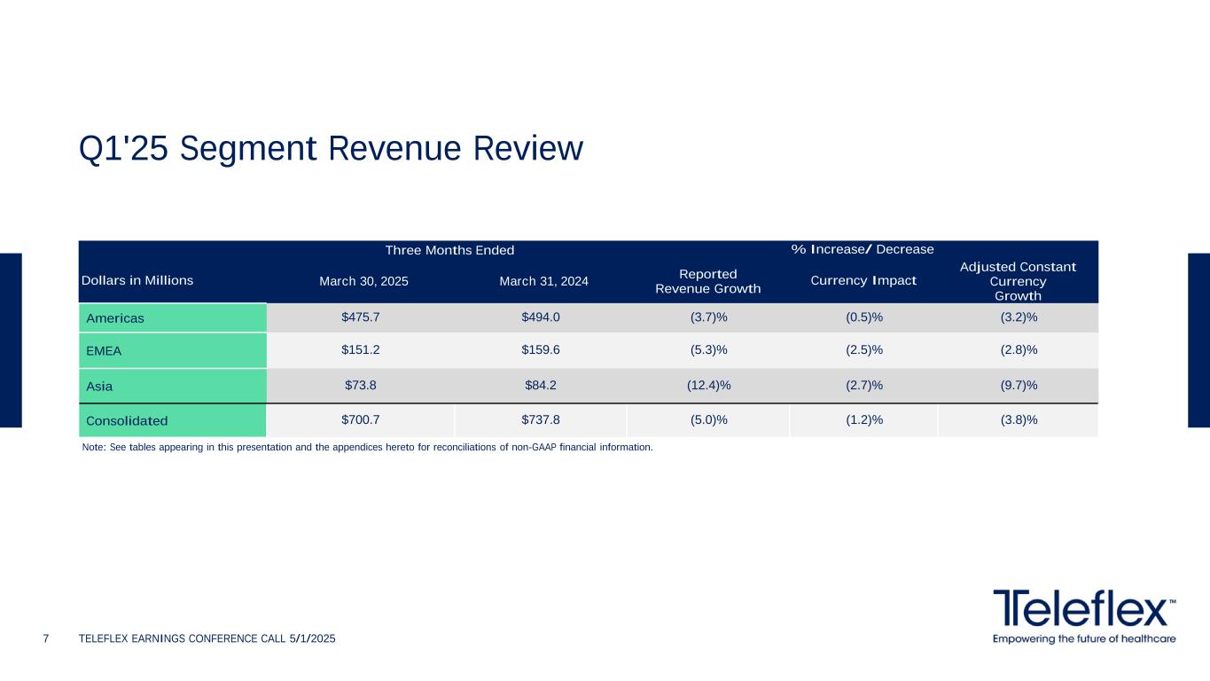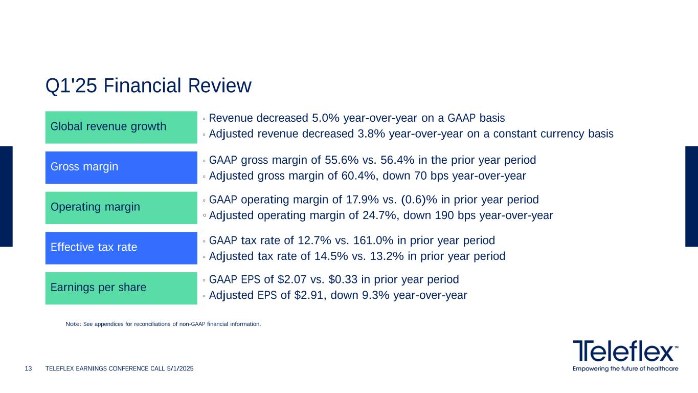 Q1 Performance Summary ◦ Maintained adjusted constant currency revenue growth guidance range of 1.00% to 2.00% ◦ Decreased the range for adjusted diluted EPS from continuing operations guidance to $13.20 to $13.60, compared to the prior range of $13.95 to $14.35 ◦ Q1'25 adjusted constant currency revenue declined 3.8% year- over-year ◦ Q1'25 adjusted gross margin of 60.4% and adjusted operating margin of 24.7% ◦ Q1'25 adjusted EPS of $2.91, a 9.3% decrease year-over-year Q1'25 Highlights 2025 Financial Guidance Note: See tables appearing in this presentation and the appendices hereto for reconciliations of non-GAAP financial information. TELEFLEX EARNINGS CONFERENCE CALL 5/1/2025