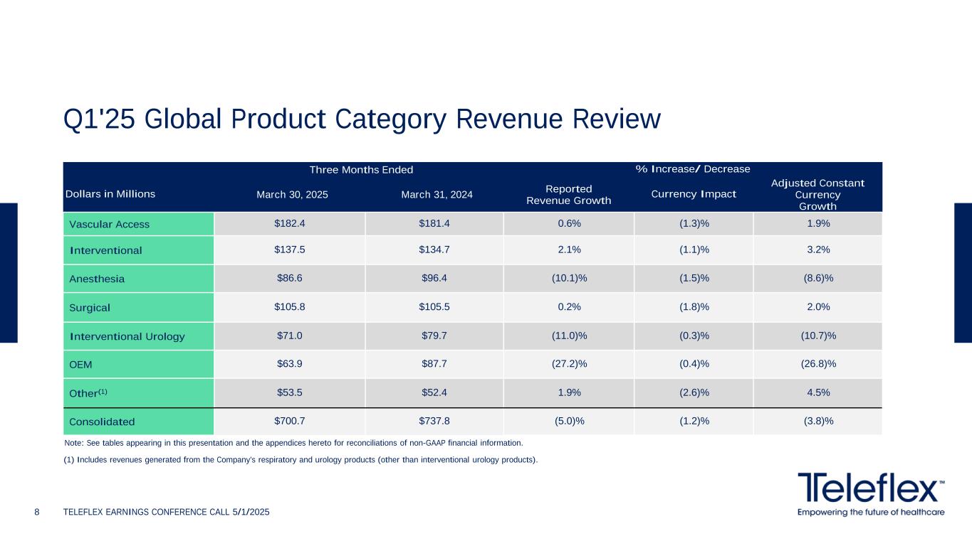 Q1'25 Segment Revenue Review TELEFLEX EARNINGS CONFERENCE CALL 5/1/20257 Three Months Ended % Increase/ Decrease Dollars in Millions March 30, 2025 March 31, 2024 Reported Revenue Growth Currency Impact Adjusted Constant Currency Growth Americas $475.7 $494.0 (3.7)% (0.5)% (3.2)% EMEA $151.2 $159.6 (5.3)% (2.5)% (2.8)% Asia $73.8 $84.2 (12.4)% (2.7)% (9.7)% Consolidated $700.7 $737.8 (5.0)% (1.2)% (3.8)% Note: See tables appearing in this presentation and the appendices hereto for reconciliations of non-GAAP financial information.