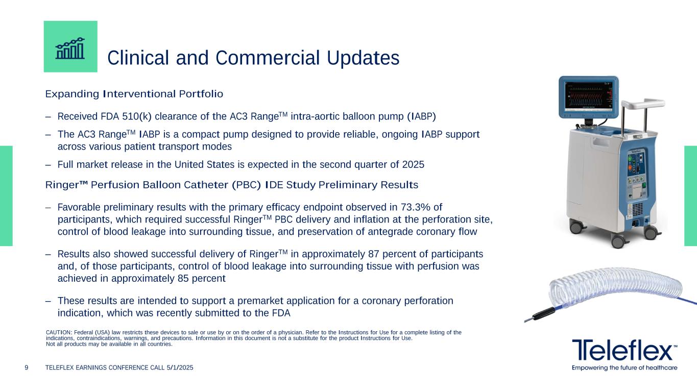 CAUTION: Federal (USA) law restricts these devices to sale or use by or on the order of a physician. Refer to the Instructions for Use for a complete listing of the indications, contraindications, warnings, and precautions. Information in this document is not a substitute for the product Instructions for Use. Not all products may be available in all countries. Expanding Interventional Portfolio – Received FDA 510(k) clearance of the AC3 RangeTM intra-aortic balloon pump (IABP) – The AC3 RangeTM IABP is a compact pump designed to provide reliable, ongoing IABP support across various patient transport modes – Full market release in the United States is expected in the second quarter of 2025 Ringer Perfusion Balloon Catheter (PBC) IDE Study Preliminary Results – Favorable preliminary results with the primary efficacy endpoint observed in 73.3% of participants, which required successful RingerTM PBC delivery and inflation at the perforation site, control of blood leakage into surrounding tissue, and preservation of antegrade coronary flow – Results also showed successful delivery of RingerTM in approximately 87 percent of participants and, of those participants, control of blood leakage into surrounding tissue with perfusion was achieved in approximately 85 percent – These results are intended to support a premarket application for a coronary perforation indication, which was recently submitted to the FDA Clinical and Commercial Updates TELEFLEX EARNINGS CONFERENCE CALL 5/1/20259