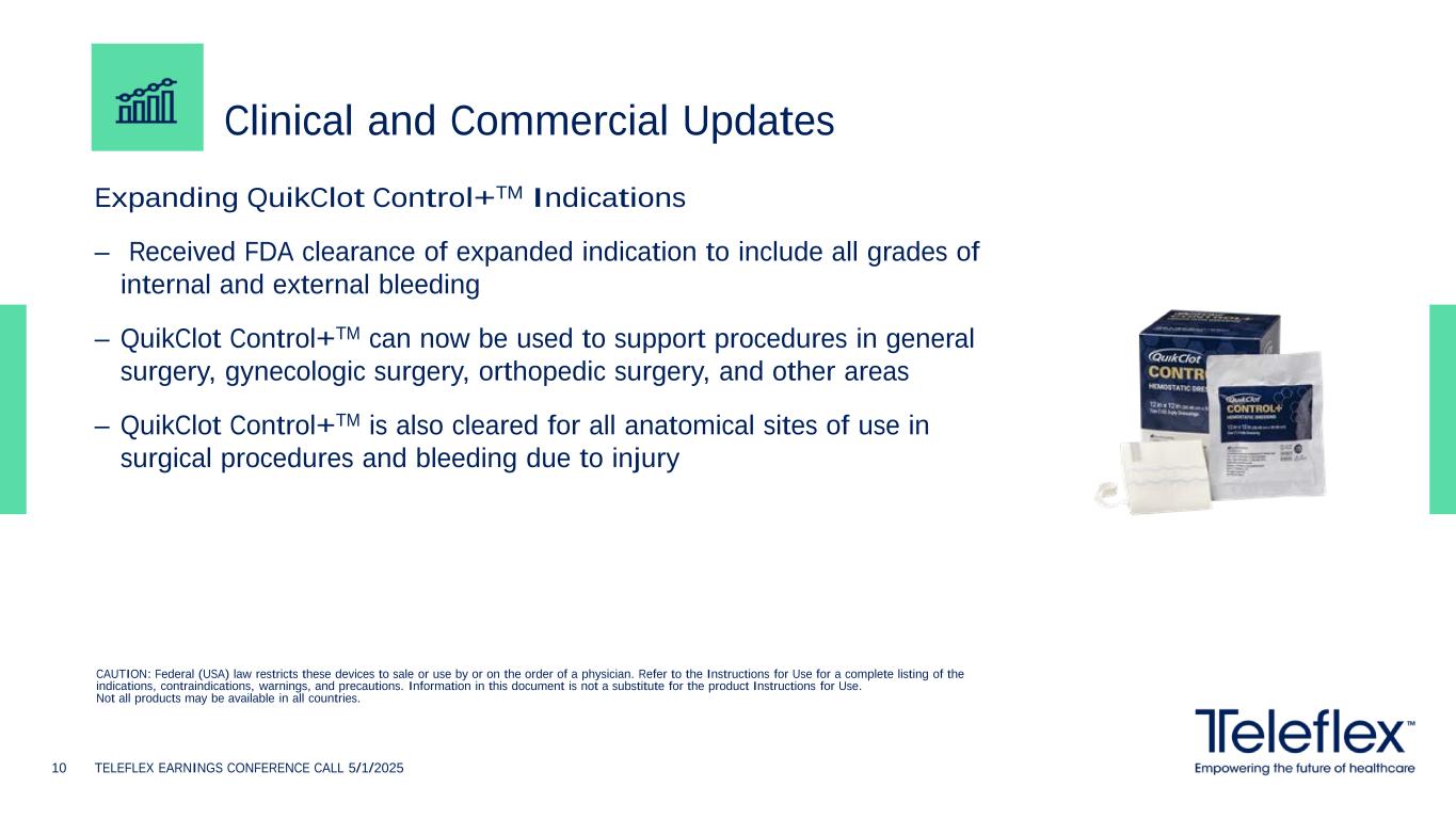 CAUTION: Federal (USA) law restricts these devices to sale or use by or on the order of a physician. Refer to the Instructions for Use for a complete listing of the indications, contraindications, warnings, and precautions. Information in this document is not a substitute for the product Instructions for Use. Not all products may be available in all countries. Expanding QuikClot Control+TM Indications – Received FDA clearance of expanded indication to include all grades of internal and external bleeding – QuikClot Control+TM can now be used to support procedures in general surgery, gynecologic surgery, orthopedic surgery, and other areas – QuikClot Control+TM is also cleared for all anatomical sites of use in surgical procedures and bleeding due to injury Clinical and Commercial Updates TELEFLEX EARNINGS CONFERENCE CALL 5/1/202510