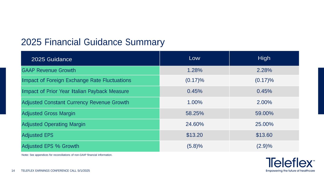 The presentation to which these appendices are attached and the following appendices include, among other things, tables reconciling the following applicable non-GAAP financial measures to the most comparable GAAP financial measure: Adjusted revenue. This non-GAAP measure is based upon net revenues, adjusted to exclude the impact in the year ended December 31, 2024 of an increase in our reserves, and corresponding reduction to revenue within our EMEA segment, for prior years. The reserve relates to the Italian payback measure, a law that requires suppliers of medical devices to the Italian National Healthcare System to make payments to the Italian government if medical device expenditures in a given year exceed regional expenditure ceilings established for that year. As a result of a ruling from the Italian courts, we recognized an increase in our reserves in the year ended December 31, 2024, of which $13.8 million related to prior years. The prior year amounts do not represent normal adjustments to revenue, are not expected to recur in future periods and are not recurring in nature, making it difficult to contribute to a meaningful evaluation of our operating performance. Accordingly, management has excluded the $13.8 million prior year amount as it is not indicative of our underlying core performance or business trends. Adjusted constant currency revenue growth. This non-GAAP measure is based upon net revenues, adjusted to exclude, depending on the period presented, the items described in Adjusted revenue and to eliminate the impact of translating the results of international subsidiaries at different currency exchange rates from period to period. The impact of changes in foreign currency may vary significantly from period to period, and such changes generally are outside of the control of our management. We believe that this measure facilitates a comparison of our operating performance exclusive of currency exchange rate fluctuations that do not reflect our underlying performance or business trends. Adjusted diluted earnings per share. This non-GAAP measure is based upon diluted earnings per share from continuing operations, the most directly comparable GAAP measure, adjusted to exclude, depending on the period presented, the impact of (i) restructuring, restructuring related, and impairment items; (ii) acquisition, integration and divestiture related items; (iii) separation costs; (iv) Italian payback measure; (v) costs incurred in connection with our implementation of a new global ERP solution and related IT transition costs; (vi) pension termination and related charges; (vii) certain costs associated with the registration of medical devices under the European Union Medical Device Regulation; (viii) intangible amortization expense; and (ix) tax adjustments. Management does not believe that any of the excluded items are indicative of our underlying core performance or business trends. Adjusted gross profit and margin. These measures exclude, depending on the period presented, the impacts of (i) restructuring, restructuring related, and impairment items, (ii) acquisition, integration and divestiture related items and (iii) Italian payback measure. Adjusted operating profit and margin. These measures exclude, depending on the period presented, the impact of (i) restructuring, restructuring related, and impairment items; (ii) acquisitions, integration and divestiture related items; (iii) separation costs; (iv) Italian payback measure; (v) costs incurred in connection with our implementation of a new global ERP solution and related IT transition costs; (vi) pension termination and related charges; (vii) intangible amortization expense; and (viii) certain costs associated with the registration of medical devices under the European Union Medical Device Regulation. Adjusted tax rate. This measure is the percentage of the Company’s adjusted taxes on income from continuing operations to its adjusted income from continuing operations before taxes. Adjusted taxes on income from continuing operations excludes, depending on the period presented, the impact of tax benefits or costs associated with (i) restructuring, restructuring related, and impairment items; (ii) acquisition, integration and divestiture related items; (iii) separation costs; (iv) Italian payback measure; (v) costs incurred in connection with our implementation of a new global ERP solution and related IT transition costs; (vi) certain costs associated with the registration of medical devices under the European Union Medical Device Regulation; (vii) intangible amortization expense; and (viii) tax adjustments. Non-GAAP Financial Measures TELEFLEX EARNINGS CONFERENCE CALL 5/1/202518