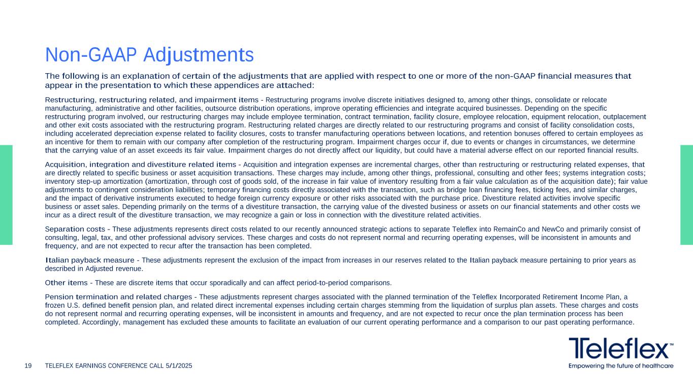 The following is an explanation of certain of the adjustments that are applied with respect to one or more of the non-GAAP financial measures that appear in the presentation to which these appendices are attached: Restructuring, restructuring related, and impairment items - Restructuring programs involve discrete initiatives designed to, among other things, consolidate or relocate manufacturing, administrative and other facilities, outsource distribution operations, improve operating efficiencies and integrate acquired businesses. Depending on the specific restructuring program involved, our restructuring charges may include employee termination, contract termination, facility closure, employee relocation, equipment relocation, outplacement and other exit costs associated with the restructuring program. Restructuring related charges are directly related to our restructuring programs and consist of facility consolidation costs, including accelerated depreciation expense related to facility closures, costs to transfer manufacturing operations between locations, and retention bonuses offered to certain employees as an incentive for them to remain with our company after completion of the restructuring program. Impairment charges occur if, due to events or changes in circumstances, we determine that the carrying value of an asset exceeds its fair value. Impairment charges do not directly affect our liquidity, but could have a material adverse effect on our reported financial results. Acquisition, integration and divestiture related items - Acquisition and integration expenses are incremental charges, other than restructuring or restructuring related expenses, that are directly related to specific business or asset acquisition transactions. These charges may include, among other things, professional, consulting and other fees; systems integration costs; inventory step-up amortization (amortization, through cost of goods sold, of the increase in fair value of inventory resulting from a fair value calculation as of the acquisition date); fair value adjustments to contingent consideration liabilities; temporary financing costs directly associated with the transaction, such as bridge loan financing fees, ticking fees, and similar charges, and the impact of derivative instruments executed to hedge foreign currency exposure or other risks associated with the purchase price. Divestiture related activities involve specific business or asset sales. Depending primarily on the terms of a divestiture transaction, the carrying value of the divested business or assets on our financial statements and other costs we incur as a direct result of the divestiture transaction, we may recognize a gain or loss in connection with the divestiture related activities. Separation costs - These adjustments represents direct costs related to our recently announced strategic actions to separate Teleflex into RemainCo and NewCo and primarily consist of consulting, legal, tax, and other professional advisory services. These charges and costs do not represent normal and recurring operating expenses, will be inconsistent in amounts and frequency, and are not expected to recur after the transaction has been completed. Italian payback measure - These adjustments represent the exclusion of the impact from increases in our reserves related to the Italian payback measure pertaining to prior years as described in Adjusted revenue. Other items - These are discrete items that occur sporadically and can affect period-to-period comparisons. Pension termination and related charges - These adjustments represent charges associated with the planned termination of the Teleflex Incorporated Retirement Income Plan, a frozen U.S. defined benefit pension plan, and related direct incremental expenses including certain charges stemming from the liquidation of surplus plan assets. These charges and costs do not represent normal and recurring operating expenses, will be inconsistent in amounts and frequency, and are not expected to recur once the plan termination process has been completed. Accordingly, management has excluded these amounts to facilitate an evaluation of our current operating performance and a comparison to our past operating performance. Non-GAAP Adjustments TELEFLEX EARNINGS CONFERENCE CALL 5/1/202519