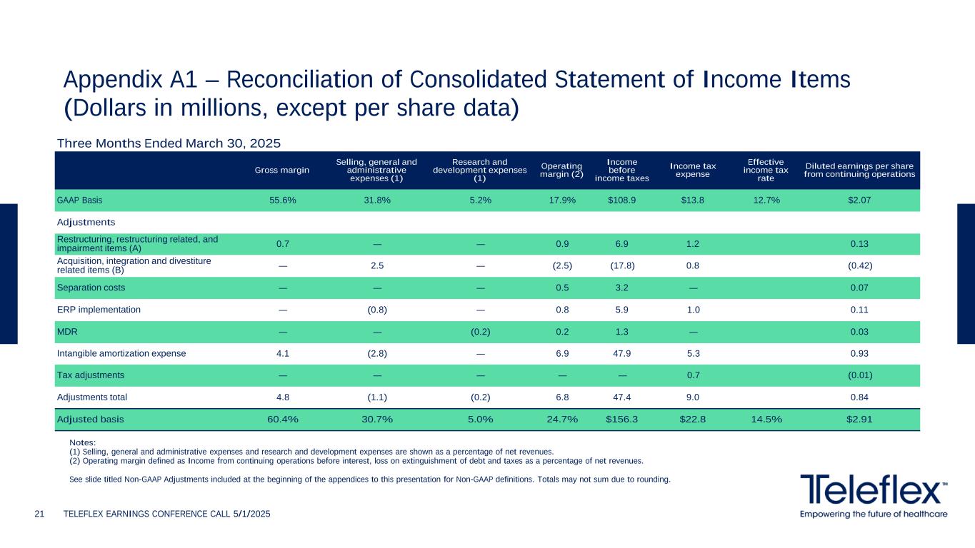 Appendix A1 – Reconciliation of Consolidated Statement of Income Items (Dollars in millions, except per share data) TELEFLEX EARNINGS CONFERENCE CALL 5/1/202521 Three Months Ended March 30, 2025 Gross margin Selling, general and administrative expenses (1) Research and development expenses (1) Operating margin (2) Income before income taxes Income tax expense Effective income tax rate Diluted earnings per share from continuing operations GAAP Basis 55.6% 31.8% 5.2% 17.9% $108.9 $13.8 12.7% $2.07 Adjustments Restructuring, restructuring related, and impairment items (A) 0.7 — — 0.9 6.9 1.2 0.13 Acquisition, integration and divestiture related items (B) — 2.5 — (2.5) (17.8) 0.8 (0.42) Separation costs — — — 0.5 3.2 — 0.07 ERP implementation — (0.8) — 0.8 5.9 1.0 0.11 MDR — — (0.2) 0.2 1.3 — 0.03 Intangible amortization expense 4.1 (2.8) — 6.9 47.9 5.3 0.93 Tax adjustments — — — — — 0.7 (0.01) Adjustments total 4.8 (1.1) (0.2) 6.8 47.4 9.0 0.84 Adjusted basis 60.4% 30.7% 5.0% 24.7% $156.3 $22.8 14.5% $2.91 Notes: (1) Selling, general and administrative expenses and research and development expenses are shown as a percentage of net revenues. (2) Operating margin defined as Income from continuing operations before interest, loss on extinguishment of debt and taxes as a percentage of net revenues. See slide titled Non-GAAP Adjustments included at the beginning of the appendices to this presentation for Non-GAAP definitions. Totals may not sum due to rounding.