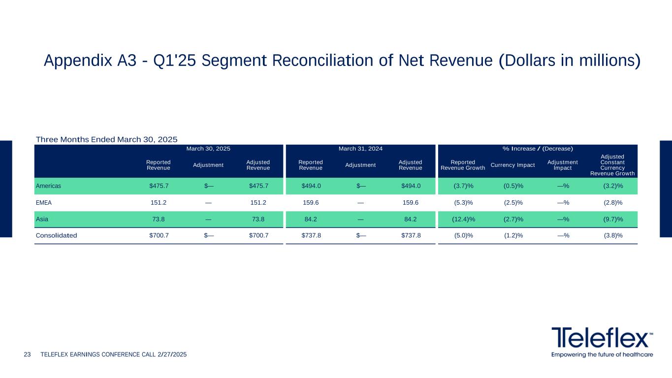Three Months Ended March 30, 2025 March 30, 2025 March 31, 2024 % Increase / (Decrease) Reported Revenue Adjustment Adjusted Revenue Reported Revenue Adjustment Adjusted Revenue Reported Revenue Growth Currency Impact Adjustment Impact Adjusted Constant Currency Revenue Growth Americas $475.7 $— $475.7 $494.0 $— $494.0 (3.7)% (0.5)% —% (3.2)% EMEA 151.2 — 151.2 159.6 — 159.6 (5.3)% (2.5)% —% (2.8)% Asia 73.8 — 73.8 84.2 — 84.2 (12.4)% (2.7)% —% (9.7)% Consolidated $700.7 $— $700.7 $737.8 $— $737.8 (5.0)% (1.2)% —% (3.8)% TELEFLEX EARNINGS CONFERENCE CALL 2/27/202523 Appendix A3 - Q1'25 Segment Reconciliation of Net Revenue (Dollars in millions)