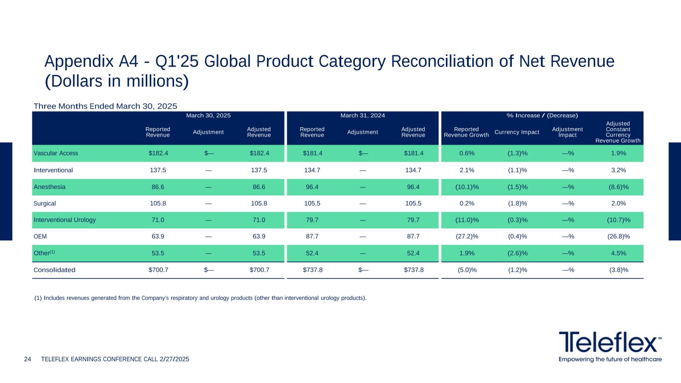 Three Months Ended March 30, 2025 March 30, 2025 March 31, 2024 % Increase / (Decrease) Reported Revenue Adjustment Adjusted Revenue Reported Revenue Adjustment Adjusted Revenue Reported Revenue Growth Currency Impact Adjustment Impact Adjusted Constant Currency Revenue Growth Vascular Access $182.4 $— $182.4 $181.4 $— $181.4 0.6% (1.3)% —% 1.9% Interventional 137.5 — 137.5 134.7 — 134.7 2.1% (1.1)% —% 3.2% Anesthesia 86.6 — 86.6 96.4 — 96.4 (10.1)% (1.5)% —% (8.6)% Surgical 105.8 — 105.8 105.5 — 105.5 0.2% (1.8)% —% 2.0% Interventional Urology 71.0 — 71.0 79.7 — 79.7 (11.0)% (0.3)% —% (10.7)% OEM 63.9 — 63.9 87.7 — 87.7 (27.2)% (0.4)% —% (26.8)% Other(1) 53.5 — 53.5 52.4 — 52.4 1.9% (2.6)% —% 4.5% Consolidated $700.7 $— $700.7 $737.8 $— $737.8 (5.0)% (1.2)% —% (3.8)% TELEFLEX EARNINGS CONFERENCE CALL 2/27/202524 Appendix A4 - Q1'25 Global Product Category Reconciliation of Net Revenue (Dollars in millions) (1) Includes revenues generated from the Company’s respiratory and urology products (other than interventional urology products).