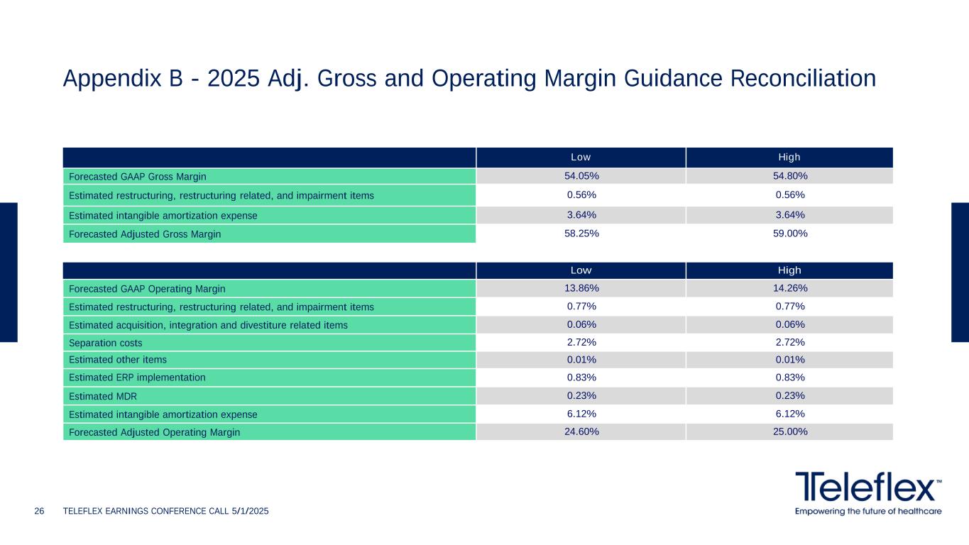Appendix B - 2025 Adj. Gross and Operating Margin Guidance Reconciliation TELEFLEX EARNINGS CONFERENCE CALL 5/1/202526 Low High Forecasted GAAP Gross Margin 54.05% 54.80% Estimated restructuring, restructuring related, and impairment items 0.56% 0.56% Estimated intangible amortization expense 3.64% 3.64% Forecasted Adjusted Gross Margin 58.25% 59.00% Low High Forecasted GAAP Operating Margin 13.86% 14.26% Estimated restructuring, restructuring related, and impairment items 0.77% 0.77% Estimated acquisition, integration and divestiture related items 0.06% 0.06% Separation costs 2.72% 2.72% Estimated other items 0.01% 0.01% Estimated ERP implementation 0.83% 0.83% Estimated MDR 0.23% 0.23% Estimated intangible amortization expense 6.12% 6.12% Forecasted Adjusted Operating Margin 24.60% 25.00%