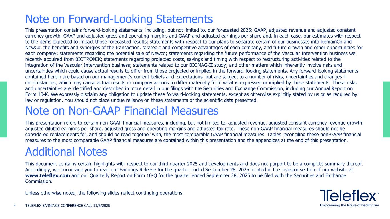 The following is an explanation of certain of the adjustments that are applied with respect to one or more of the non-GAAP financial measures that appear in the presentation to which these appendices are attached: Restructuring and rationalization charges - Restructuring and rationalization charges include expenses associated with discrete initiatives designed to, among other things, consolidate or relocate manufacturing, administrative and other facilities, outsource distribution operations, improve operating efficiencies, integrate acquired businesses and optimize product portfolios through targeted rationalization efforts. These changes include qualified restructuring costs (which may include employee termination, contract termination, facility closure, employee relocation, equipment relocation, outplacement), restructuring related (which may include accelerated depreciation expense related to facility closures, costs to transfer manufacturing operations between locations, and retention bonuses offered to certain employees as an incentive for them to remain with our company after completion of a restructuring program) and product line exit charges. Impairment charges - Impairment charges, including those related to goodwill, and other assets occur if, due to events or changes in circumstances, we determine that the carrying value of an asset exceeds its fair value. Impairment charges do not directly affect our liquidity, but could have a material adverse effect on our reported financial results. Acquisition, integration and divestiture related items - Acquisition and integration expenses are incremental charges, other than restructuring or restructuring related expenses, that are directly related to specific business or asset acquisition transactions. These charges may include, among other things, professional, consulting and other fees; systems integration costs; inventory step-up amortization (amortization, through cost of goods sold, of the increase in fair value of inventory resulting from a fair value calculation as of the acquisition date); fair value adjustments to contingent consideration liabilities; temporary financing costs directly associated with the transaction, such as bridge loan financing fees, ticking fees, and similar charges, and the impact of derivative instruments executed to hedge foreign currency exposure or other risks associated with the purchase price. Divestiture related activities involve specific business or asset sales. Depending primarily on the terms of a divestiture transaction, the carrying value of the divested business or assets on our financial statements and other costs we incur as a direct result of the divestiture transaction, we may recognize a gain or loss in connection with the divestiture related activities. Separation costs - These adjustments represents direct costs related to our recently announced strategic actions to separate Teleflex into RemainCo and NewCo and primarily consist of consulting, legal, tax, and other professional advisory services. These charges and costs do not represent normal and recurring operating expenses, will be inconsistent in amounts and frequency, and are not expected to recur after the transaction has been completed. Italian payback measure - These adjustments represent the exclusion of adjustments in our reserves related to the Italian payback measure as described in Adjusted revenue. Other - These are discrete items that occur sporadically and can affect period-to-period comparisons. Pension termination and related charges - These adjustments represent charges associated with the planned termination of the Teleflex Incorporated Retirement Income Plan, a frozen U.S. defined benefit pension plan, and related direct incremental expenses including certain charges stemming from the liquidation of surplus plan assets. These charges and costs do not represent normal and recurring operating expenses, will be inconsistent in amounts and frequency, and are not expected to recur once the plan termination process has been completed. Accordingly, management has excluded these amounts to facilitate an evaluation of our current operating performance and a comparison to our past operating performance. Non-GAAP Adjustments TELEFLEX EARNINGS CONFERENCE CALL 11/6/202521