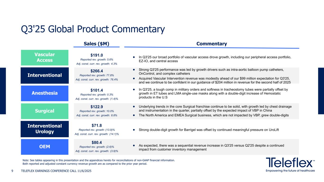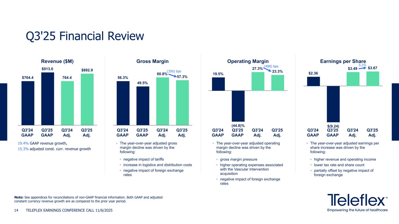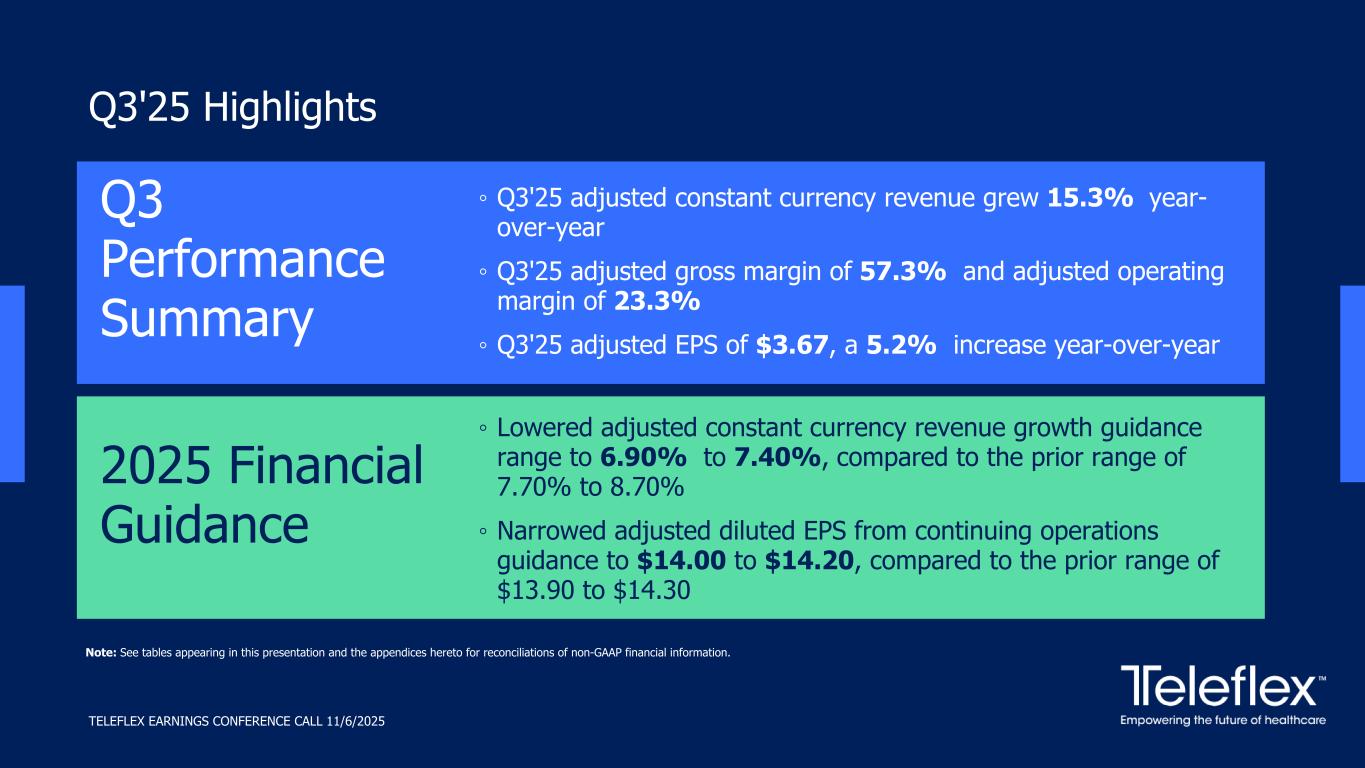 Q3 Performance Summary ◦ Lowered adjusted constant currency revenue growth guidance range to 6.90% to 7.40%, compared to the prior range of 7.70% to 8.70% ◦ Narrowed adjusted diluted EPS from continuing operations guidance to $14.00 to $14.20, compared to the prior range of $13.90 to $14.30 ◦ Q3'25 adjusted constant currency revenue grew 15.3% year- over-year ◦ Q3'25 adjusted gross margin of 57.3% and adjusted operating margin of 23.3% ◦ Q3'25 adjusted EPS of $3.67, a 5.2% increase year-over-year Q3'25 Highlights 2025 Financial Guidance Note: See tables appearing in this presentation and the appendices hereto for reconciliations of non-GAAP financial information. TELEFLEX EARNINGS CONFERENCE CALL 11/6/2025