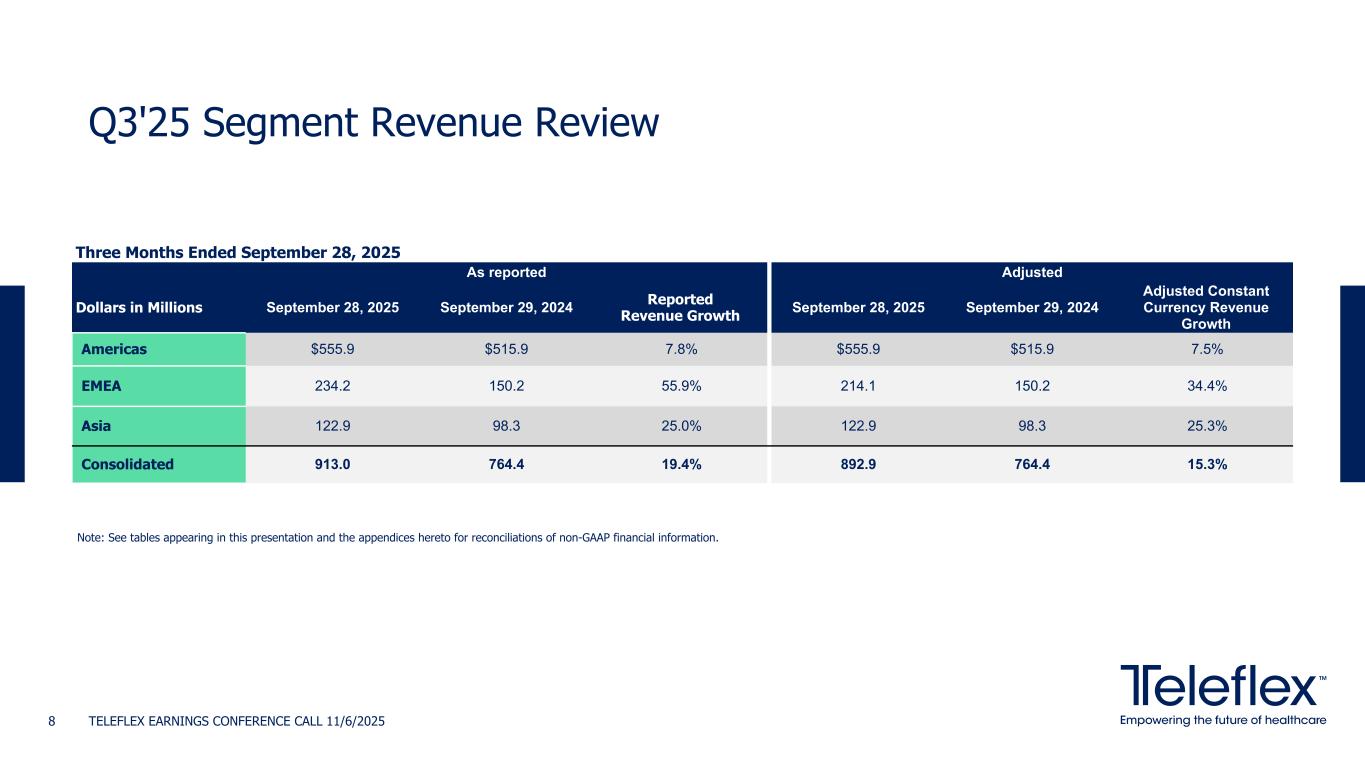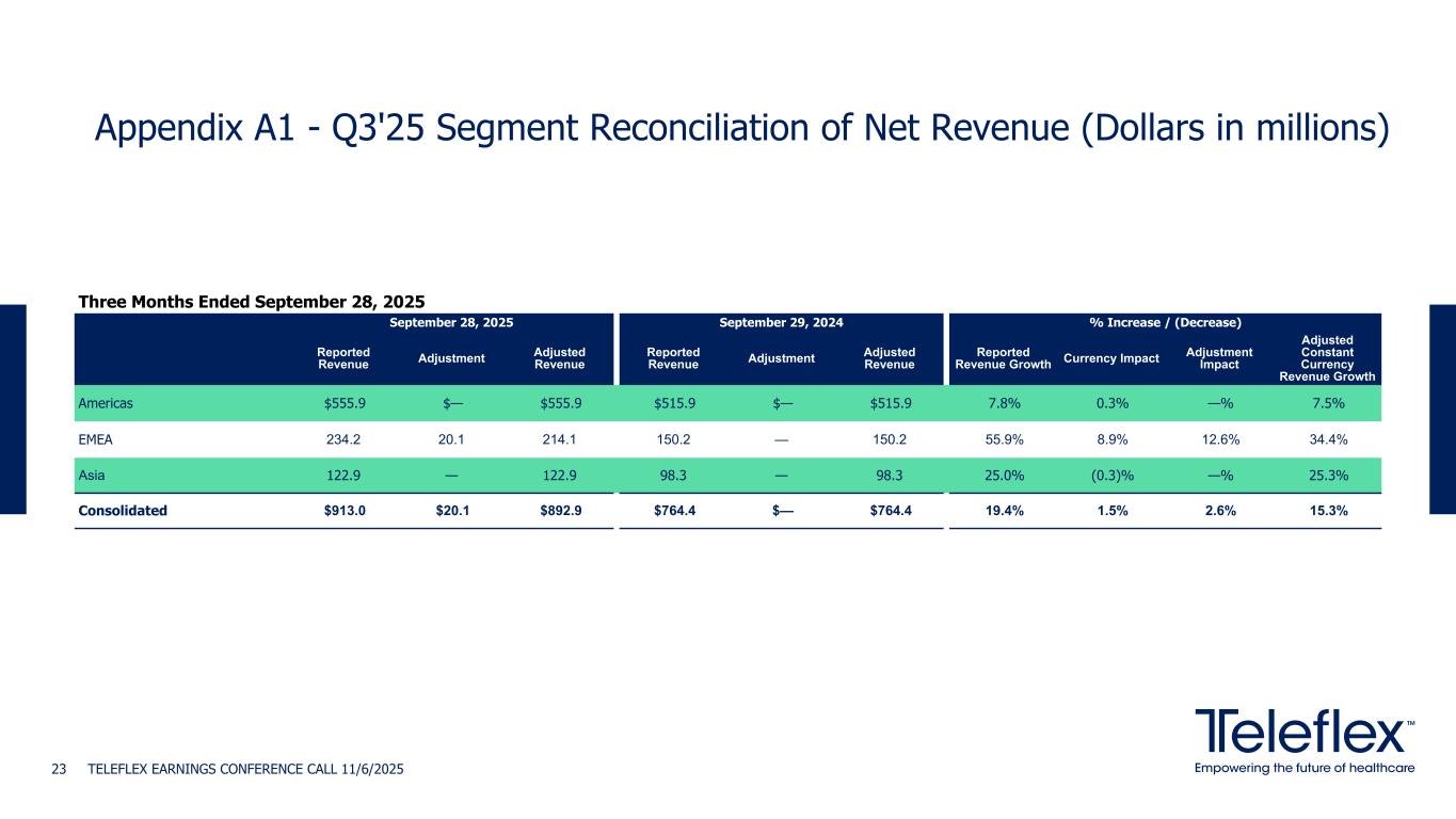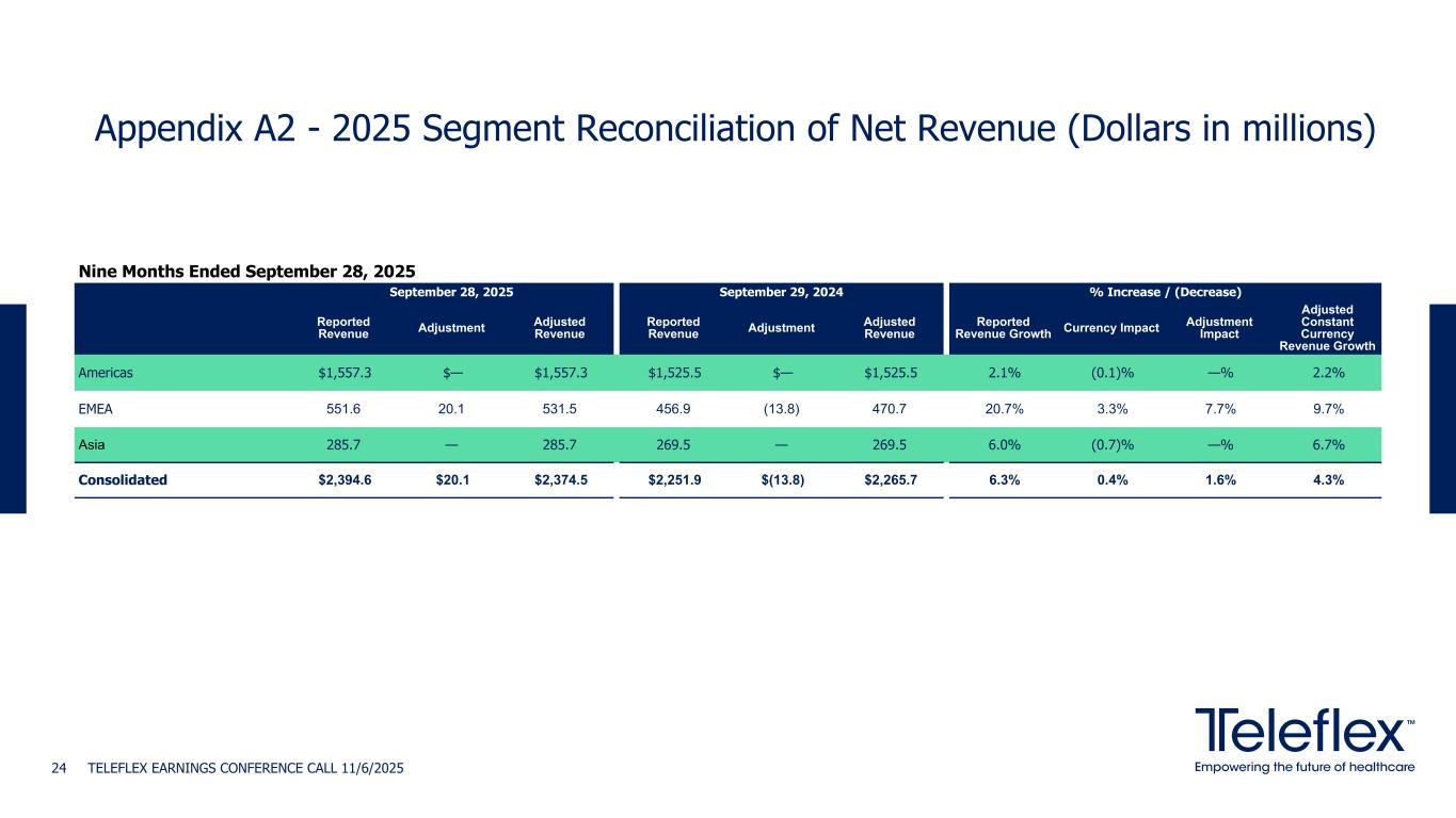 Three Months Ended September 28, 2025 September 28, 2025 September 29, 2024 % Increase / (Decrease) Reported Revenue Adjustment Adjusted Revenue Reported Revenue Adjustment Adjusted Revenue Reported Revenue Growth Currency Impact Adjustment Impact Adjusted Constant Currency Revenue Growth Americas $555.9 $— $555.9 $515.9 $— $515.9 7.8% 0.3% —% 7.5% EMEA 234.2 20.1 214.1 150.2 — 150.2 55.9% 8.9% 12.6% 34.4% Asia 122.9 — 122.9 98.3 — 98.3 25.0% (0.3)% —% 25.3% Consolidated $913.0 $20.1 $892.9 $764.4 $— $764.4 19.4% 1.5% 2.6% 15.3% TELEFLEX EARNINGS CONFERENCE CALL 11/6/202523 Appendix A1 - Q3'25 Segment Reconciliation of Net Revenue (Dollars in millions)