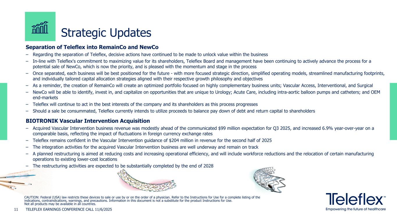 CAUTION: Federal (USA) law restricts these devices to sale or use by or on the order of a physician. Refer to the Instructions for Use for a complete listing of the indications, contraindications, warnings, and precautions. Information in this document is not a substitute for the product Instructions for Use. Not all products may be available in all countries. Separation of Teleflex into RemainCo and NewCo – Regarding the separation of Teleflex, decisive actions have continued to be made to unlock value within the business – In-line with Teleflex's commitment to maximizing value for its shareholders, Teleflex Board and management have been continuing to actively advance the process for a potential sale of NewCo, which is now the priority, and is pleased with the momentum and stage in the process – Once separated, each business will be best positioned for the future - with more focused strategic direction, simplified operating models, streamlined manufacturing footprints, and individually tailored capital allocation strategies aligned with their respective growth philosophy and objectives – As a reminder, the creation of RemainCo will create an optimized portfolio focused on highly complementary business units; Vascular Access, Interventional, and Surgical – NewCo will be able to identify, invest in, and capitalize on opportunities that are unique to Urology; Acute Care, including intra-aortic balloon pumps and catheters; and OEM end-markets – Teleflex will continue to act in the best interests of the company and its shareholders as this process progresses – Should a sale be consummated, Teleflex currently intends to utilize proceeds to balance pay down of debt and return capital to shareholders BIOTRONIK Vascular Intervention Acquisition – Acquired Vascular Intervention business revenue was modestly ahead of the communicated $99 million expectation for Q3 2025, and increased 6.9% year-over-year on a comparable basis, reflecting the impact of fluctuations in foreign currency exchange rates – Teleflex remains confident in the Vascular Intervention guidance of $204 million in revenue for the second half of 2025 – The integration activities for the acquired Vascular Intervention business are well underway and remain on track – A planned restructuring is aimed at reducing costs and increasing operational efficiency, and will include workforce reductions and the relocation of certain manufacturing operations to existing lower-cost locations – The restructuring activities are expected to be substantially completed by the end of 2028 Strategic Updates 11 TELEFLEX EARNINGS CONFERENCE CALL 11/6/2025