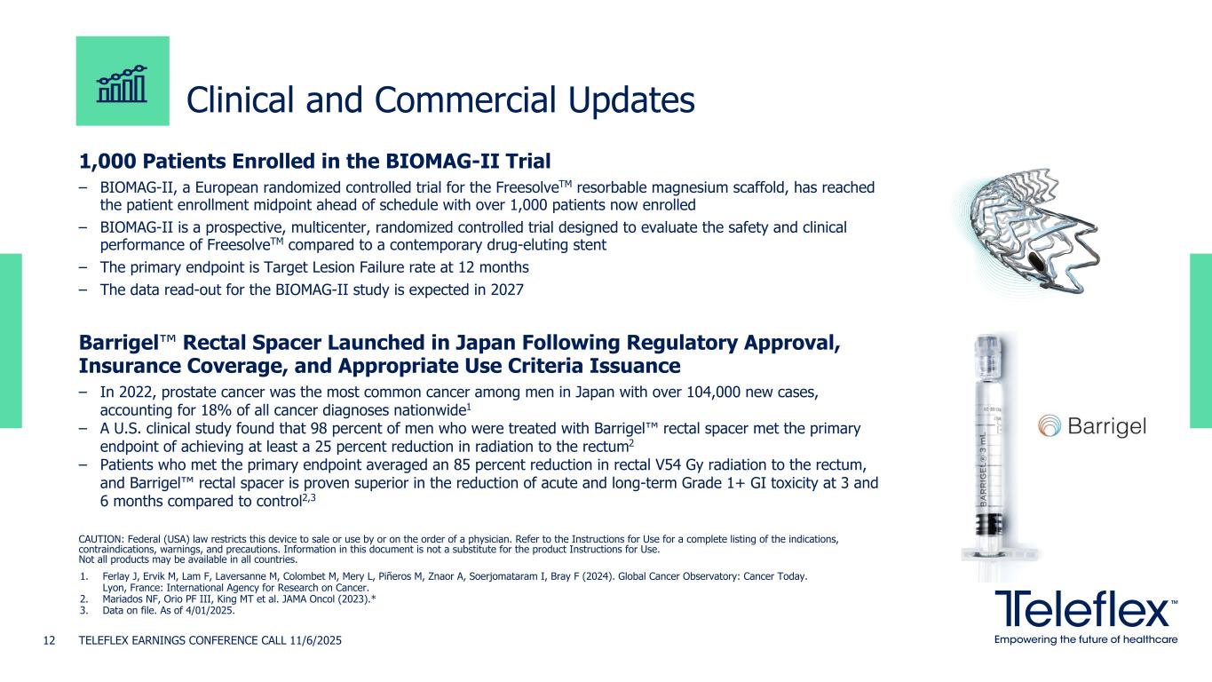 CAUTION: Federal (USA) law restricts this device to sale or use by or on the order of a physician. Refer to the Instructions for Use for a complete listing of the indications, contraindications, warnings, and precautions. Information in this document is not a substitute for the product Instructions for Use. Not all products may be available in all countries. 1,000 Patients Enrolled in the BIOMAG-II Trial – BIOMAG-II, a European randomized controlled trial for the FreesolveTM resorbable magnesium scaffold, has reached the patient enrollment midpoint ahead of schedule with over 1,000 patients now enrolled – BIOMAG-II is a prospective, multicenter, randomized controlled trial designed to evaluate the safety and clinical performance of FreesolveTM compared to a contemporary drug-eluting stent – The primary endpoint is Target Lesion Failure rate at 12 months – The data read-out for the BIOMAG-II study is expected in 2027 Barrigel™ Rectal Spacer Launched in Japan Following Regulatory Approval, Insurance Coverage, and Appropriate Use Criteria Issuance – In 2022, prostate cancer was the most common cancer among men in Japan with over 104,000 new cases, accounting for 18% of all cancer diagnoses nationwide1 – A U.S. clinical study found that 98 percent of men who were treated with Barrigel™ rectal spacer met the primary endpoint of achieving at least a 25 percent reduction in radiation to the rectum2 – Patients who met the primary endpoint averaged an 85 percent reduction in rectal V54 Gy radiation to the rectum, and Barrigel™ rectal spacer is proven superior in the reduction of acute and long-term Grade 1+ GI toxicity at 3 and 6 months compared to control2,3 Clinical and Commercial Updates TELEFLEX EARNINGS CONFERENCE CALL 11/6/202512 1. Ferlay J, Ervik M, Lam F, Laversanne M, Colombet M, Mery L, Piñeros M, Znaor A, Soerjomataram I, Bray F (2024). Global Cancer Observatory: Cancer Today. Lyon, France: International Agency for Research on Cancer. 2. Mariados NF, Orio PF III, King MT et al. JAMA Oncol (2023).* 3. Data on file. As of 4/01/2025.
