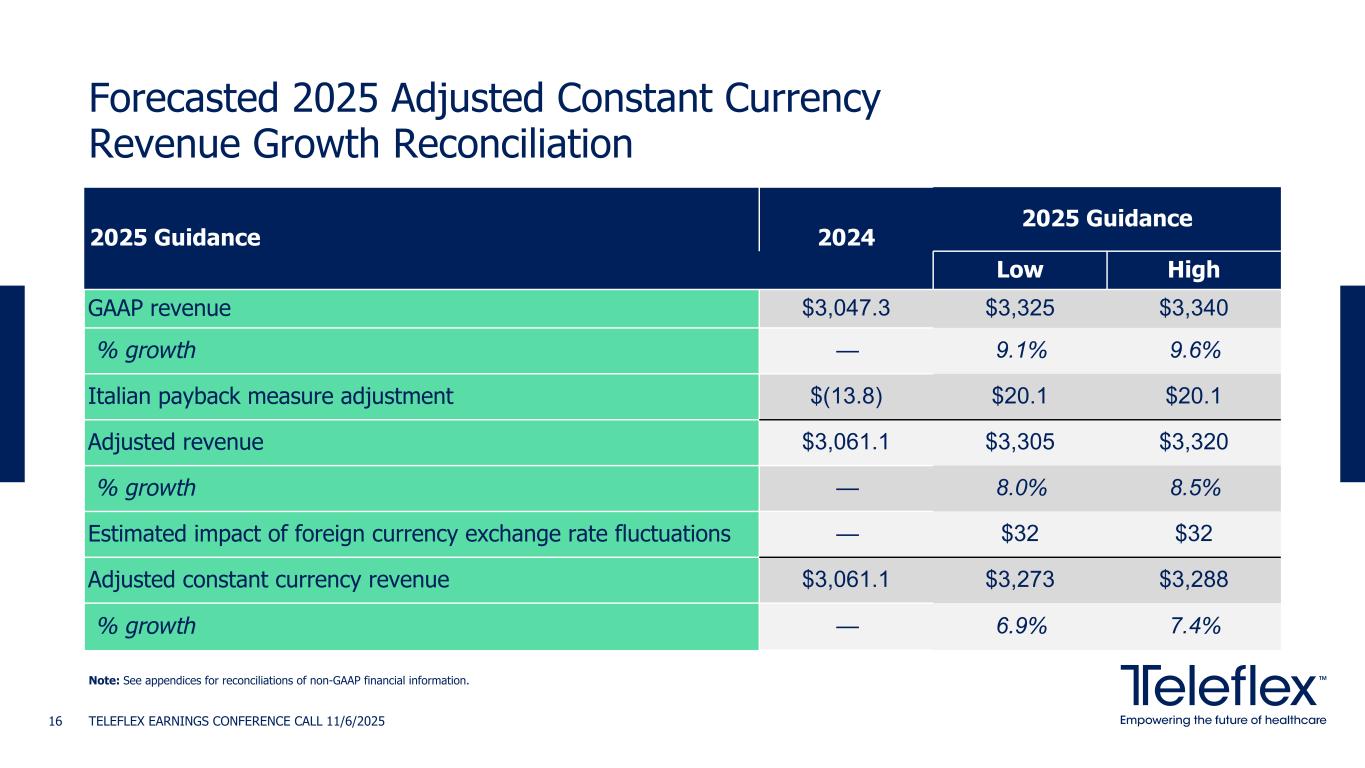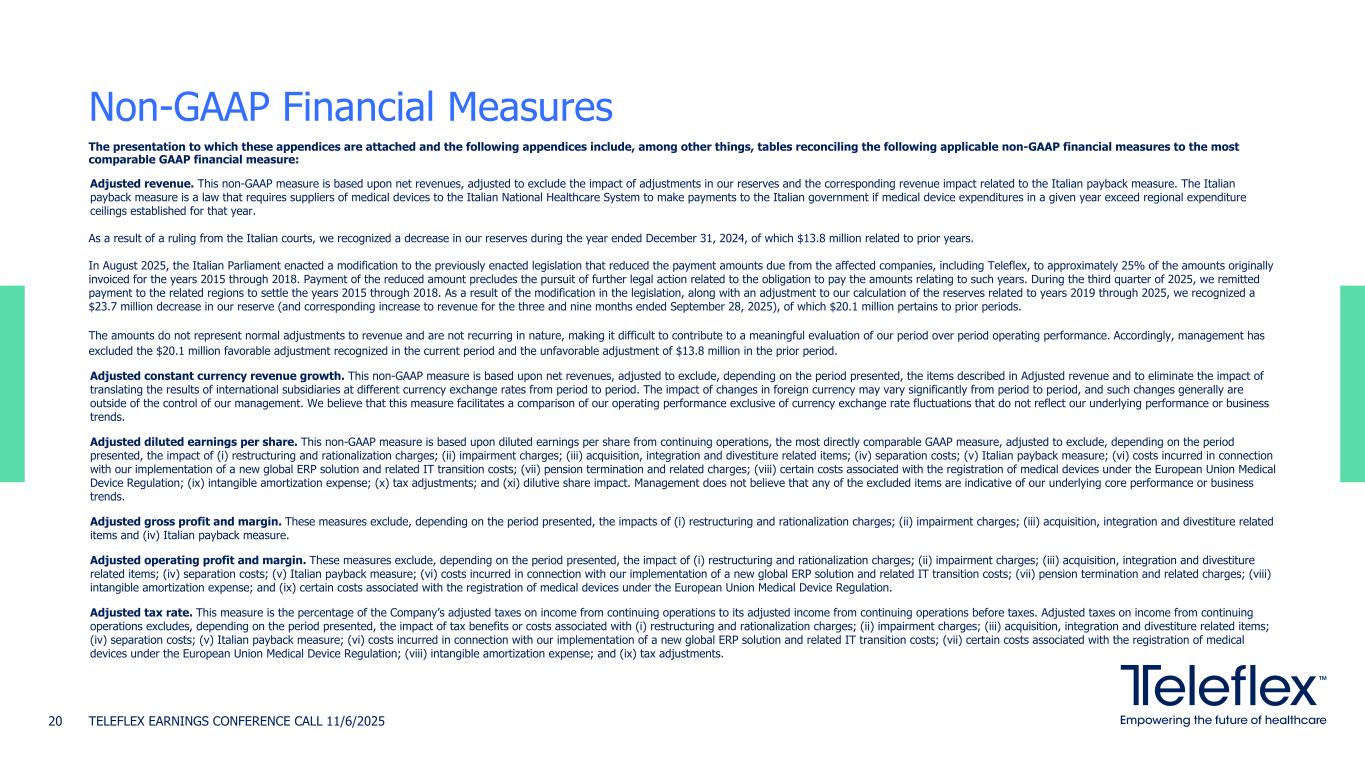 The presentation to which these appendices are attached and the following appendices include, among other things, tables reconciling the following applicable non-GAAP financial measures to the most comparable GAAP financial measure: Adjusted revenue. This non-GAAP measure is based upon net revenues, adjusted to exclude the impact of adjustments in our reserves and the corresponding revenue impact related to the Italian payback measure. The Italian payback measure is a law that requires suppliers of medical devices to the Italian National Healthcare System to make payments to the Italian government if medical device expenditures in a given year exceed regional expenditure ceilings established for that year. As a result of a ruling from the Italian courts, we recognized a decrease in our reserves during the year ended December 31, 2024, of which $13.8 million related to prior years. In August 2025, the Italian Parliament enacted a modification to the previously enacted legislation that reduced the payment amounts due from the affected companies, including Teleflex, to approximately 25% of the amounts originally invoiced for the years 2015 through 2018. Payment of the reduced amount precludes the pursuit of further legal action related to the obligation to pay the amounts relating to such years. During the third quarter of 2025, we remitted payment to the related regions to settle the years 2015 through 2018. As a result of the modification in the legislation, along with an adjustment to our calculation of the reserves related to years 2019 through 2025, we recognized a $23.7 million decrease in our reserve (and corresponding increase to revenue for the three and nine months ended September 28, 2025), of which $20.1 million pertains to prior periods. The amounts do not represent normal adjustments to revenue and are not recurring in nature, making it difficult to contribute to a meaningful evaluation of our period over period operating performance. Accordingly, management has excluded the $20.1 million favorable adjustment recognized in the current period and the unfavorable adjustment of $13.8 million in the prior period. Adjusted constant currency revenue growth. This non-GAAP measure is based upon net revenues, adjusted to exclude, depending on the period presented, the items described in Adjusted revenue and to eliminate the impact of translating the results of international subsidiaries at different currency exchange rates from period to period. The impact of changes in foreign currency may vary significantly from period to period, and such changes generally are outside of the control of our management. We believe that this measure facilitates a comparison of our operating performance exclusive of currency exchange rate fluctuations that do not reflect our underlying performance or business trends. Adjusted diluted earnings per share. This non-GAAP measure is based upon diluted earnings per share from continuing operations, the most directly comparable GAAP measure, adjusted to exclude, depending on the period presented, the impact of (i) restructuring and rationalization charges; (ii) impairment charges; (iii) acquisition, integration and divestiture related items; (iv) separation costs; (v) Italian payback measure; (vi) costs incurred in connection with our implementation of a new global ERP solution and related IT transition costs; (vii) pension termination and related charges; (viii) certain costs associated with the registration of medical devices under the European Union Medical Device Regulation; (ix) intangible amortization expense; (x) tax adjustments; and (xi) dilutive share impact. Management does not believe that any of the excluded items are indicative of our underlying core performance or business trends. Adjusted gross profit and margin. These measures exclude, depending on the period presented, the impacts of (i) restructuring and rationalization charges; (ii) impairment charges; (iii) acquisition, integration and divestiture related items and (iv) Italian payback measure. Adjusted operating profit and margin. These measures exclude, depending on the period presented, the impact of (i) restructuring and rationalization charges; (ii) impairment charges; (iii) acquisition, integration and divestiture related items; (iv) separation costs; (v) Italian payback measure; (vi) costs incurred in connection with our implementation of a new global ERP solution and related IT transition costs; (vii) pension termination and related charges; (viii) intangible amortization expense; and (ix) certain costs associated with the registration of medical devices under the European Union Medical Device Regulation. Adjusted tax rate. This measure is the percentage of the Company’s adjusted taxes on income from continuing operations to its adjusted income from continuing operations before taxes. Adjusted taxes on income from continuing operations excludes, depending on the period presented, the impact of tax benefits or costs associated with (i) restructuring and rationalization charges; (ii) impairment charges; (iii) acquisition, integration and divestiture related items; (iv) separation costs; (v) Italian payback measure; (vi) costs incurred in connection with our implementation of a new global ERP solution and related IT transition costs; (vii) certain costs associated with the registration of medical devices under the European Union Medical Device Regulation; (viii) intangible amortization expense; and (ix) tax adjustments. Non-GAAP Financial Measures TELEFLEX EARNINGS CONFERENCE CALL 11/6/202520
