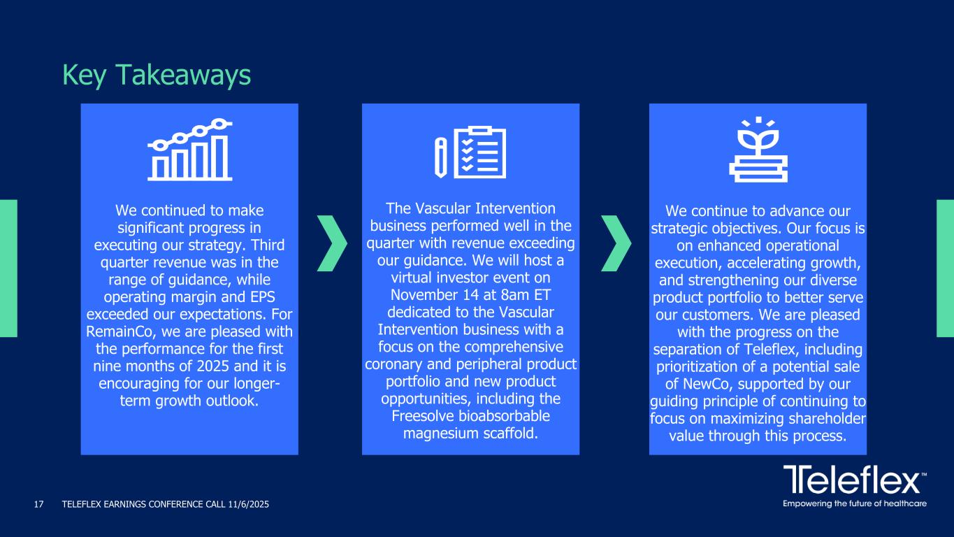 TELEFLEX EARNINGS CONFERENCE CALL 11/6/202517 Key Takeaways We continued to make significant progress in executing our strategy. Third quarter revenue was in the range of guidance, while operating margin and EPS exceeded our expectations. For RemainCo, we are pleased with the performance for the first nine months of 2025 and it is encouraging for our longer- term growth outlook. The Vascular Intervention business performed well in the quarter with revenue exceeding our guidance. We will host a virtual investor event on November 14 at 8am ET dedicated to the Vascular Intervention business with a focus on the comprehensive coronary and peripheral product portfolio and new product opportunities, including the Freesolve bioabsorbable magnesium scaffold. We continue to advance our strategic objectives. Our focus is on enhanced operational execution, accelerating growth, and strengthening our diverse product portfolio to better serve our customers. We are pleased with the progress on the separation of Teleflex, including prioritization of a potential sale of NewCo, supported by our guiding principle of continuing to focus on maximizing shareholder value through this process.