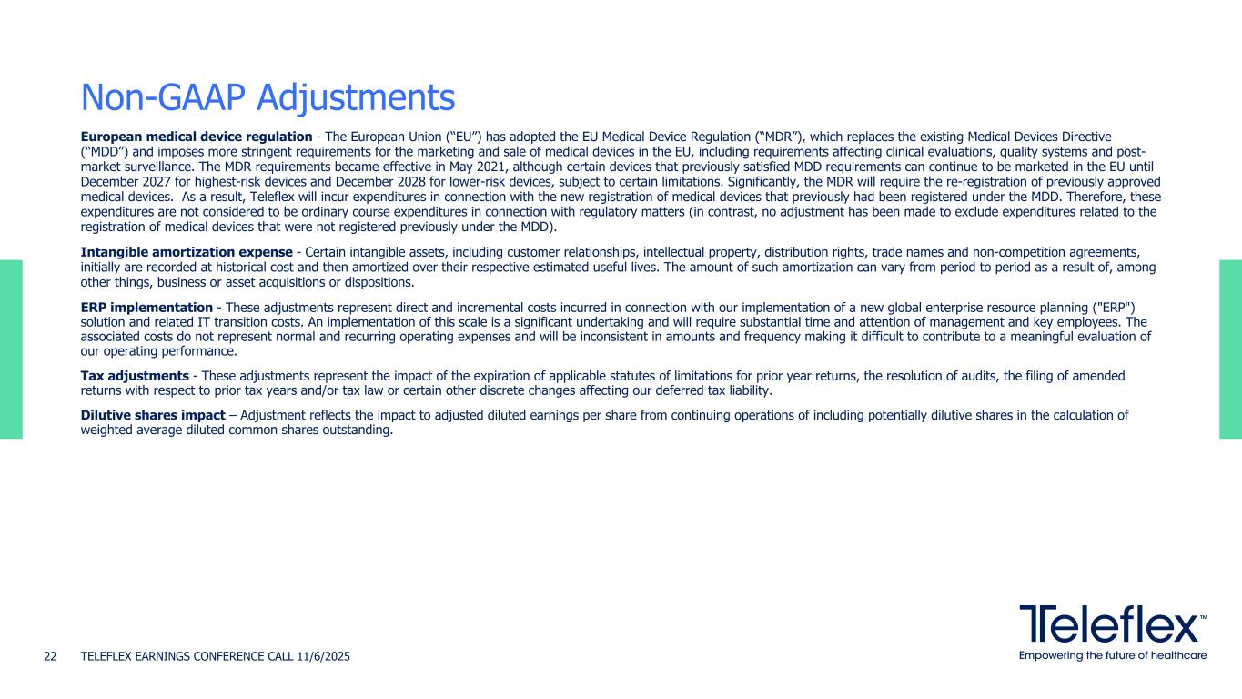 European medical device regulation - The European Union (“EU”) has adopted the EU Medical Device Regulation (“MDR”), which replaces the existing Medical Devices Directive (“MDD”) and imposes more stringent requirements for the marketing and sale of medical devices in the EU, including requirements affecting clinical evaluations, quality systems and post- market surveillance. The MDR requirements became effective in May 2021, although certain devices that previously satisfied MDD requirements can continue to be marketed in the EU until December 2027 for highest-risk devices and December 2028 for lower-risk devices, subject to certain limitations. Significantly, the MDR will require the re-registration of previously approved medical devices. As a result, Teleflex will incur expenditures in connection with the new registration of medical devices that previously had been registered under the MDD. Therefore, these expenditures are not considered to be ordinary course expenditures in connection with regulatory matters (in contrast, no adjustment has been made to exclude expenditures related to the registration of medical devices that were not registered previously under the MDD). Intangible amortization expense - Certain intangible assets, including customer relationships, intellectual property, distribution rights, trade names and non-competition agreements, initially are recorded at historical cost and then amortized over their respective estimated useful lives. The amount of such amortization can vary from period to period as a result of, among other things, business or asset acquisitions or dispositions. ERP implementation - These adjustments represent direct and incremental costs incurred in connection with our implementation of a new global enterprise resource planning ("ERP") solution and related IT transition costs. An implementation of this scale is a significant undertaking and will require substantial time and attention of management and key employees. The associated costs do not represent normal and recurring operating expenses and will be inconsistent in amounts and frequency making it difficult to contribute to a meaningful evaluation of our operating performance. Tax adjustments - These adjustments represent the impact of the expiration of applicable statutes of limitations for prior year returns, the resolution of audits, the filing of amended returns with respect to prior tax years and/or tax law or certain other discrete changes affecting our deferred tax liability. Dilutive shares impact – Adjustment reflects the impact to adjusted diluted earnings per share from continuing operations of including potentially dilutive shares in the calculation of weighted average diluted common shares outstanding. Non-GAAP Adjustments TELEFLEX EARNINGS CONFERENCE CALL 11/6/202522