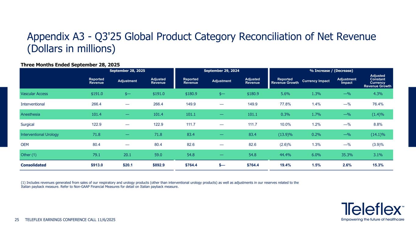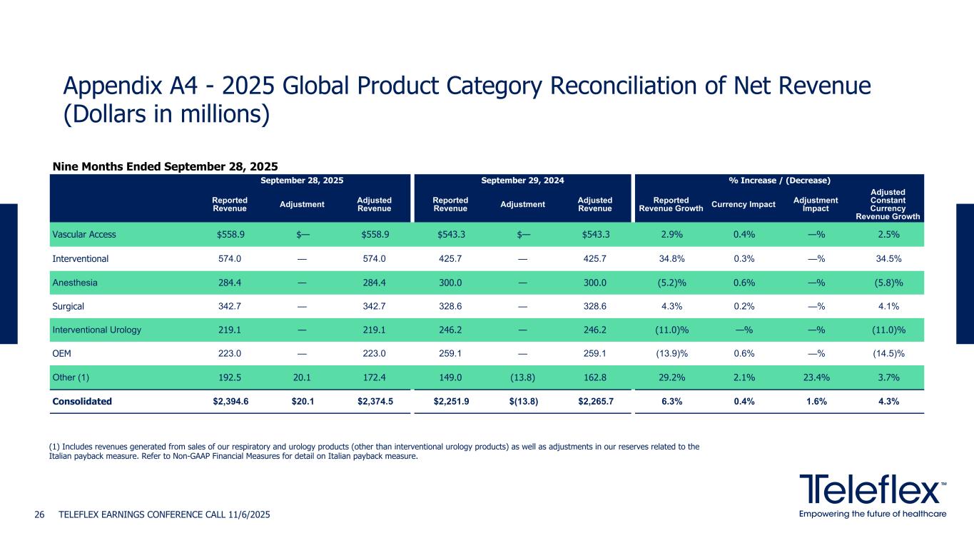 Three Months Ended September 28, 2025 September 28, 2025 September 29, 2024 % Increase / (Decrease) Reported Revenue Adjustment Adjusted Revenue Reported Revenue Adjustment Adjusted Revenue Reported Revenue Growth Currency Impact Adjustment Impact Adjusted Constant Currency Revenue Growth Vascular Access $191.0 $— $191.0 $180.9 $— $180.9 5.6% 1.3% —% 4.3% Interventional 266.4 — 266.4 149.9 — 149.9 77.8% 1.4% —% 76.4% Anesthesia 101.4 — 101.4 101.1 — 101.1 0.3% 1.7% —% (1.4)% Surgical 122.9 — 122.9 111.7 — 111.7 10.0% 1.2% —% 8.8% Interventional Urology 71.8 — 71.8 83.4 — 83.4 (13.9)% 0.2% —% (14.1)% OEM 80.4 — 80.4 82.6 — 82.6 (2.6)% 1.3% —% (3.9)% Other (1) 79.1 20.1 59.0 54.8 — 54.8 44.4% 6.0% 35.3% 3.1% Consolidated $913.0 $20.1 $892.9 $764.4 $— $764.4 19.4% 1.5% 2.6% 15.3% TELEFLEX EARNINGS CONFERENCE CALL 11/6/202525 Appendix A3 - Q3'25 Global Product Category Reconciliation of Net Revenue (Dollars in millions) (1) Includes revenues generated from sales of our respiratory and urology products (other than interventional urology products) as well as adjustments in our reserves related to the Italian payback measure. Refer to Non-GAAP Financial Measures for detail on Italian payback measure.