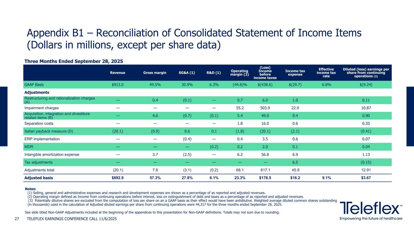 Appendix B1 – Reconciliation of Consolidated Statement of Income Items (Dollars in millions, except per share data) TELEFLEX EARNINGS CONFERENCE CALL 11/6/202527 Three Months Ended September 28, 2025 Revenue Gross margin SG&A (1) R&D (1) Operating margin (2) (Loss) Income before income taxes Income tax expense Effective income tax rate Diluted (loss) earnings per share from continuing operations (3) GAAP Basis $913.0 49.5% 30.9% 6.3% (44.8)% $(438.6) $(29.7) 6.8% $(9.24) Adjustments Restructuring and rationalization charges (A) — 0.4 (0.1) — 0.7 6.0 1.0 0.11 Impairment charges — — — — 55.2 503.9 22.9 10.87 Acquisition, integration and divestiture related items (B) — 4.6 (0.7) (0.1) 5.4 49.0 9.4 0.90 Separation costs — — — — 1.8 16.0 0.6 0.35 Italian payback measure (D) (20.1) (0.9) 0.6 0.1 (1.8) (20.1) (2.1) (0.41) ERP implementation — — (0.4) — 0.4 3.5 0.6 0.07 MDR — — — (0.2) 0.2 2.0 0.1 0.04 Intangible amortization expense — 3.7 (2.5) — 6.2 56.8 6.9 1.13 Tax adjustments — — — — — — 6.5 (0.15) Adjustments total (20.1) 7.8 (3.1) (0.2) 68.1 617.1 45.9 12.91 Adjusted basis $892.9 57.3% 27.8% 6.1% 23.3% $178.5 $16.2 9.1% $3.67 Notes: (1) Selling, general and administrative expenses and research and development expenses are shown as a percentage of as reported and adjusted revenues. (2) Operating margin defined as Income from continuing operations before interest, loss on extinguishment of debt and taxes as a percentage of as reported and adjusted revenues. (3) Potentially dilutive shares are excluded from the computation of loss per share on an a GAAP basis as their effect would have been antidilutive. Weighted average diluted common shares outstanding (in thousands) used in the calculation of Adjusted diluted earnings per share from continuing operations were 44,317 for the three months ended September 28, 2025. See slide titled Non-GAAP Adjustments included at the beginning of the appendices to this presentation for Non-GAAP definitions. Totals may not sum due to rounding.