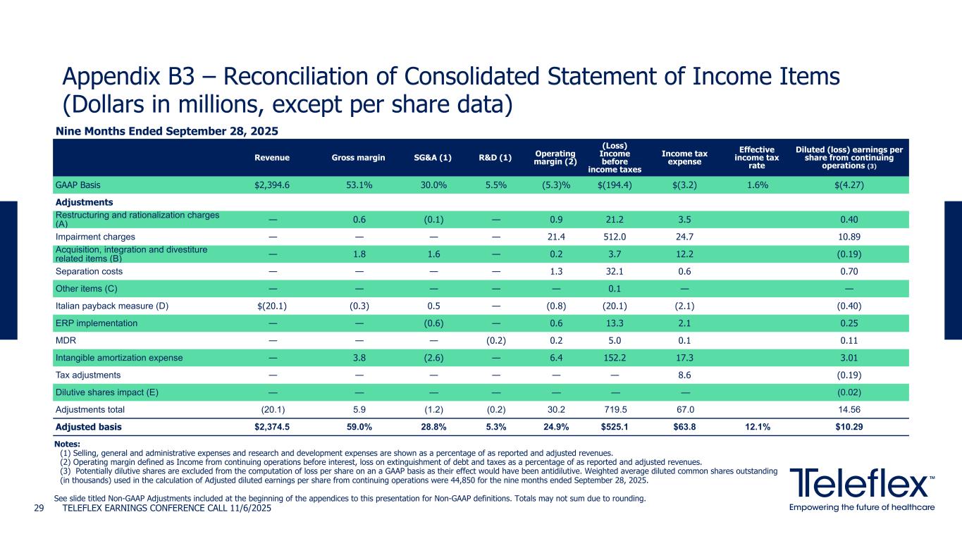 Three Months Ended September 29, 2024 Revenue Gross margin SG&A (1) R&D (1) Operating margin (2) Income before income taxes Income tax expense Effective income tax rate Diluted earnings per share from continuing operations GAAP Basis $764.4 56.3% 31.6% 5.1% 19.5% $130.6 $19.6 15.0% $2.36 Adjustments Restructuring and rationalization charges (A) — 0.7 (0.1) — 0.9 6.8 1.2 0.12 Acquisition, integration and divestiture related items (B) — — (0.3) — 0.3 2.0 — 0.04 ERP implementation — — (0.8) — 0.8 6.1 1.0 0.11 MDR — — — (0.2) 0.2 1.3 — 0.03 Pension termination costs — — 0.7 — (0.7) (5.4) (1.3) (0.09) Intangible amortization expense — 3.8 (2.5) — 6.3 48.3 5.2 0.92 Adjustments total — 4.5 (3.0) (0.2) 7.8 59.1 6.1 1.13 Adjusted basis $764.4 60.8% 28.6% 4.9% 27.3% $189.7 $25.7 13.6% $3.49 TELEFLEX EARNINGS CONFERENCE CALL 11/6/202528 Notes: (1) Selling, general and administrative expenses and research and development expenses are shown as a percentage of net revenues. (2) Operating margin defined as Income from continuing operations before interest, loss on extinguishment of debt and taxes as a percentage of net revenues. See slide titled Non-GAAP Adjustments included at the beginning of the appendices to this presentation for Non-GAAP definitions. Totals may not sum due to rounding. Appendix B2 – Reconciliation of Consolidated Statement of Income Items (Dollars in millions, except per share data)