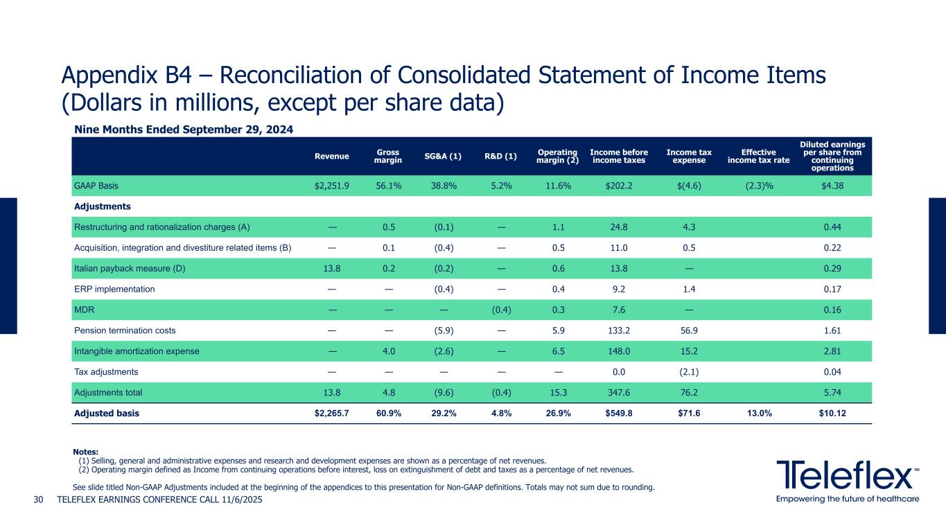 Appendix B3 – Reconciliation of Consolidated Statement of Income Items (Dollars in millions, except per share data) TELEFLEX EARNINGS CONFERENCE CALL 11/6/202529 Nine Months Ended September 28, 2025 Revenue Gross margin SG&A (1) R&D (1) Operating margin (2) (Loss) Income before income taxes Income tax expense Effective income tax rate Diluted (loss) earnings per share from continuing operations (3) GAAP Basis $2,394.6 53.1% 30.0% 5.5% (5.3)% $(194.4) $(3.2) 1.6% $(4.27) Adjustments Restructuring and rationalization charges (A) — 0.6 (0.1) — 0.9 21.2 3.5 0.40 Impairment charges — — — — 21.4 512.0 24.7 10.89 Acquisition, integration and divestiture related items (B) — 1.8 1.6 — 0.2 3.7 12.2 (0.19) Separation costs — — — — 1.3 32.1 0.6 0.70 Other items (C) — — — — — 0.1 — — Italian payback measure (D) $(20.1) (0.3) 0.5 — (0.8) (20.1) (2.1) (0.40) ERP implementation — — (0.6) — 0.6 13.3 2.1 0.25 MDR — — — (0.2) 0.2 5.0 0.1 0.11 Intangible amortization expense — 3.8 (2.6) — 6.4 152.2 17.3 3.01 Tax adjustments — — — — — — 8.6 (0.19) Dilutive shares impact (E) — — — — — — — (0.02) Adjustments total (20.1) 5.9 (1.2) (0.2) 30.2 719.5 67.0 14.56 Adjusted basis $2,374.5 59.0% 28.8% 5.3% 24.9% $525.1 $63.8 12.1% $10.29 Notes: (1) Selling, general and administrative expenses and research and development expenses are shown as a percentage of as reported and adjusted revenues. (2) Operating margin defined as Income from continuing operations before interest, loss on extinguishment of debt and taxes as a percentage of as reported and adjusted revenues. (3) Potentially dilutive shares are excluded from the computation of loss per share on an a GAAP basis as their effect would have been antidilutive. Weighted average diluted common shares outstanding (in thousands) used in the calculation of Adjusted diluted earnings per share from continuing operations were 44,850 for the nine months ended September 28, 2025. See slide titled Non-GAAP Adjustments included at the beginning of the appendices to this presentation for Non-GAAP definitions. Totals may not sum due to rounding.
