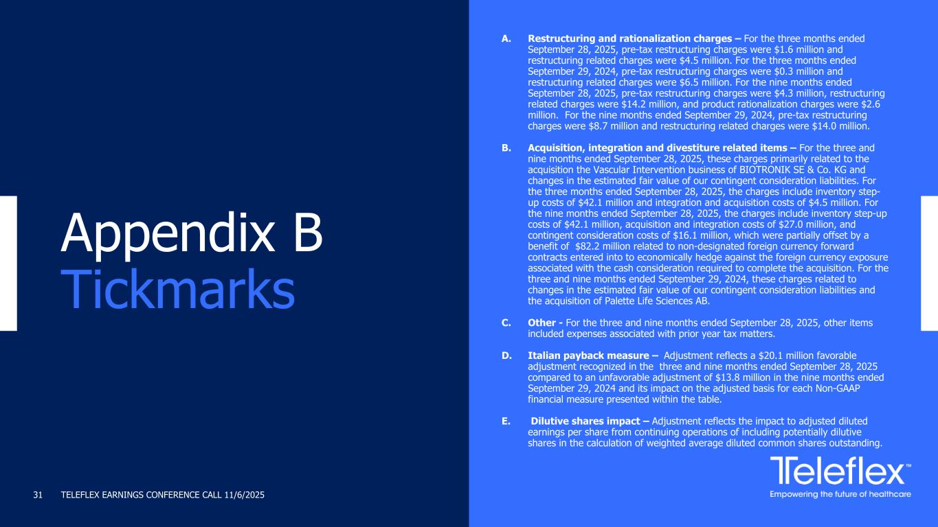 TELEFLEX EARNINGS CONFERENCE CALL 11/6/202531 A. Restructuring and rationalization charges – For the three months ended September 28, 2025, pre-tax restructuring charges were $1.6 million and restructuring related charges were $4.5 million. For the three months ended September 29, 2024, pre-tax restructuring charges were $0.3 million and restructuring related charges were $6.5 million. For the nine months ended September 28, 2025, pre-tax restructuring charges were $4.3 million, restructuring related charges were $14.2 million, and product rationalization charges were $2.6 million. For the nine months ended September 29, 2024, pre-tax restructuring charges were $8.7 million and restructuring related charges were $14.0 million. B. Acquisition, integration and divestiture related items – For the three and nine months ended September 28, 2025, these charges primarily related to the acquisition the Vascular Intervention business of BIOTRONIK SE & Co. KG and changes in the estimated fair value of our contingent consideration liabilities. For the three months ended September 28, 2025, the charges include inventory step- up costs of $42.1 million and integration and acquisition costs of $4.5 million. For the nine months ended September 28, 2025, the charges include inventory step-up costs of $42.1 million, acquisition and integration costs of $27.0 million, and contingent consideration costs of $16.1 million, which were partially offset by a benefit of $82.2 million related to non-designated foreign currency forward contracts entered into to economically hedge against the foreign currency exposure associated with the cash consideration required to complete the acquisition. For the three and nine months ended September 29, 2024, these charges related to changes in the estimated fair value of our contingent consideration liabilities and the acquisition of Palette Life Sciences AB. C. Other - For the three and nine months ended September 28, 2025, other items included expenses associated with prior year tax matters. D. Italian payback measure – Adjustment reflects a $20.1 million favorable adjustment recognized in the three and nine months ended September 28, 2025 compared to an unfavorable adjustment of $13.8 million in the nine months ended September 29, 2024 and its impact on the adjusted basis for each Non-GAAP financial measure presented within the table. E. Dilutive shares impact – Adjustment reflects the impact to adjusted diluted earnings per share from continuing operations of including potentially dilutive shares in the calculation of weighted average diluted common shares outstanding. Appendix B Tickmarks