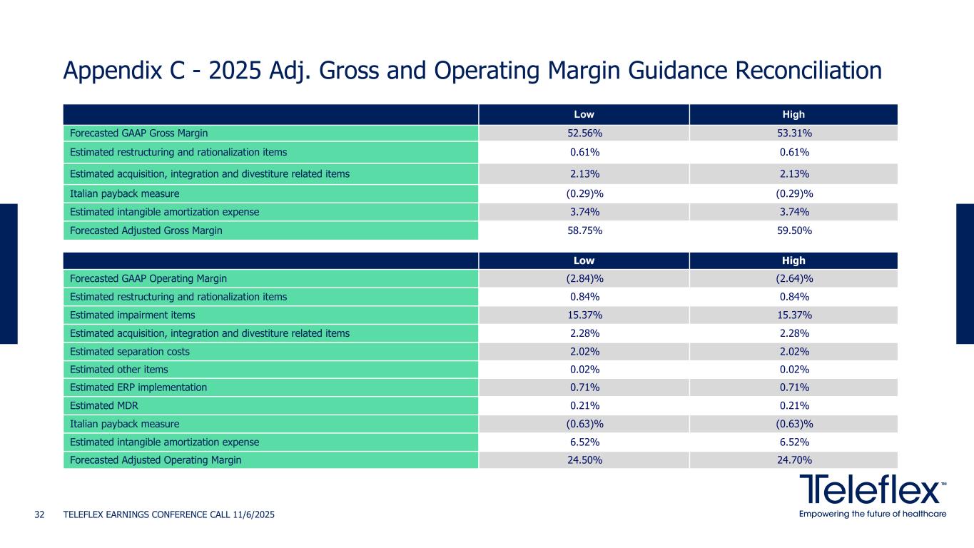 Appendix C - 2025 Adj. Gross and Operating Margin Guidance Reconciliation TELEFLEX EARNINGS CONFERENCE CALL 11/6/202532 Low High Forecasted GAAP Gross Margin 52.56% 53.31% Estimated restructuring and rationalization items 0.61% 0.61% Estimated acquisition, integration and divestiture related items 2.13% 2.13% Italian payback measure (0.29)% (0.29)% Estimated intangible amortization expense 3.74% 3.74% Forecasted Adjusted Gross Margin 58.75% 59.50% Low High Forecasted GAAP Operating Margin (2.84)% (2.64)% Estimated restructuring and rationalization items 0.84% 0.84% Estimated impairment items 15.37% 15.37% Estimated acquisition, integration and divestiture related items 2.28% 2.28% Estimated separation costs 2.02% 2.02% Estimated other items 0.02% 0.02% Estimated ERP implementation 0.71% 0.71% Estimated MDR 0.21% 0.21% Italian payback measure (0.63)% (0.63)% Estimated intangible amortization expense 6.52% 6.52% Forecasted Adjusted Operating Margin 24.50% 24.70%